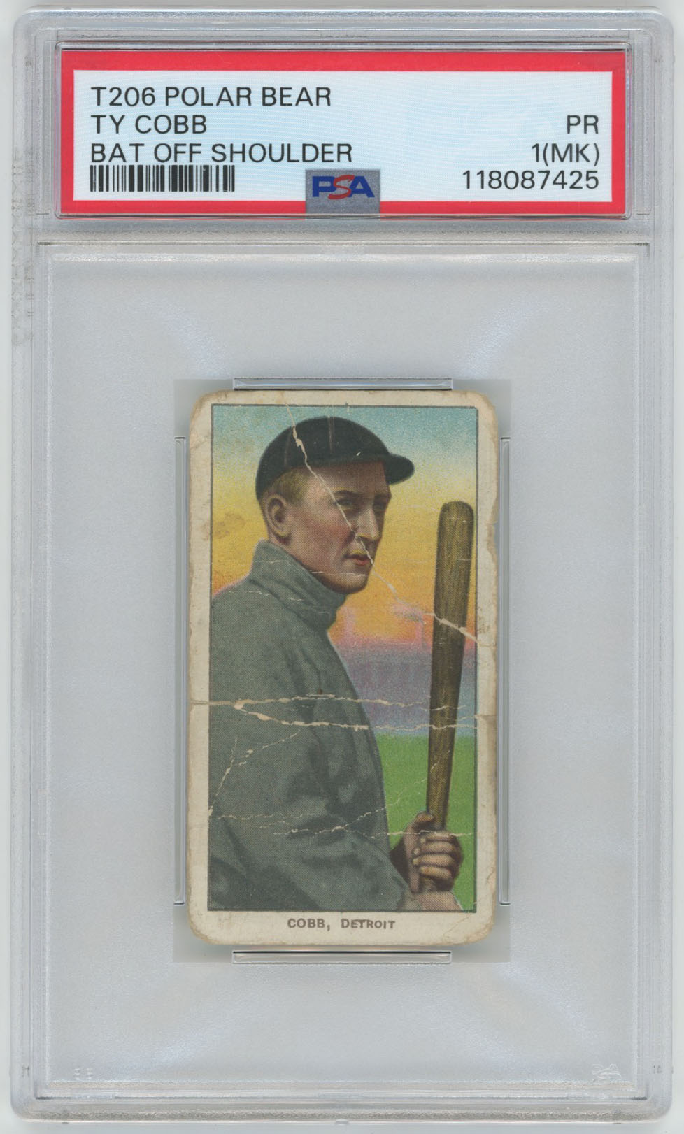 A vital Ty Cobb card, a key to this classic and widely collected set. Freshly slabbed from an old time collector, this card earns its grade with creasing and corner wear. Still the card retains a colorful pastel image, and the Polar Bear back has no paper loss. This is not an easy card to find with a Polar Bear back. Despite the condition, this should be a very popular lot.