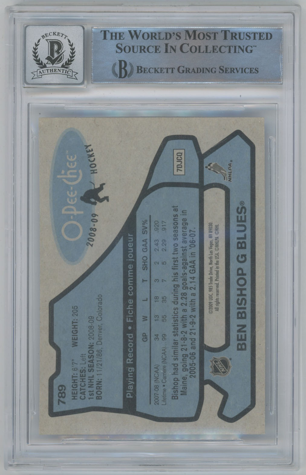 2008 O-Pee-Chee Retro 789 Ben Bishop Signed RC Parallel Beckett Beckett 10 (auto)
