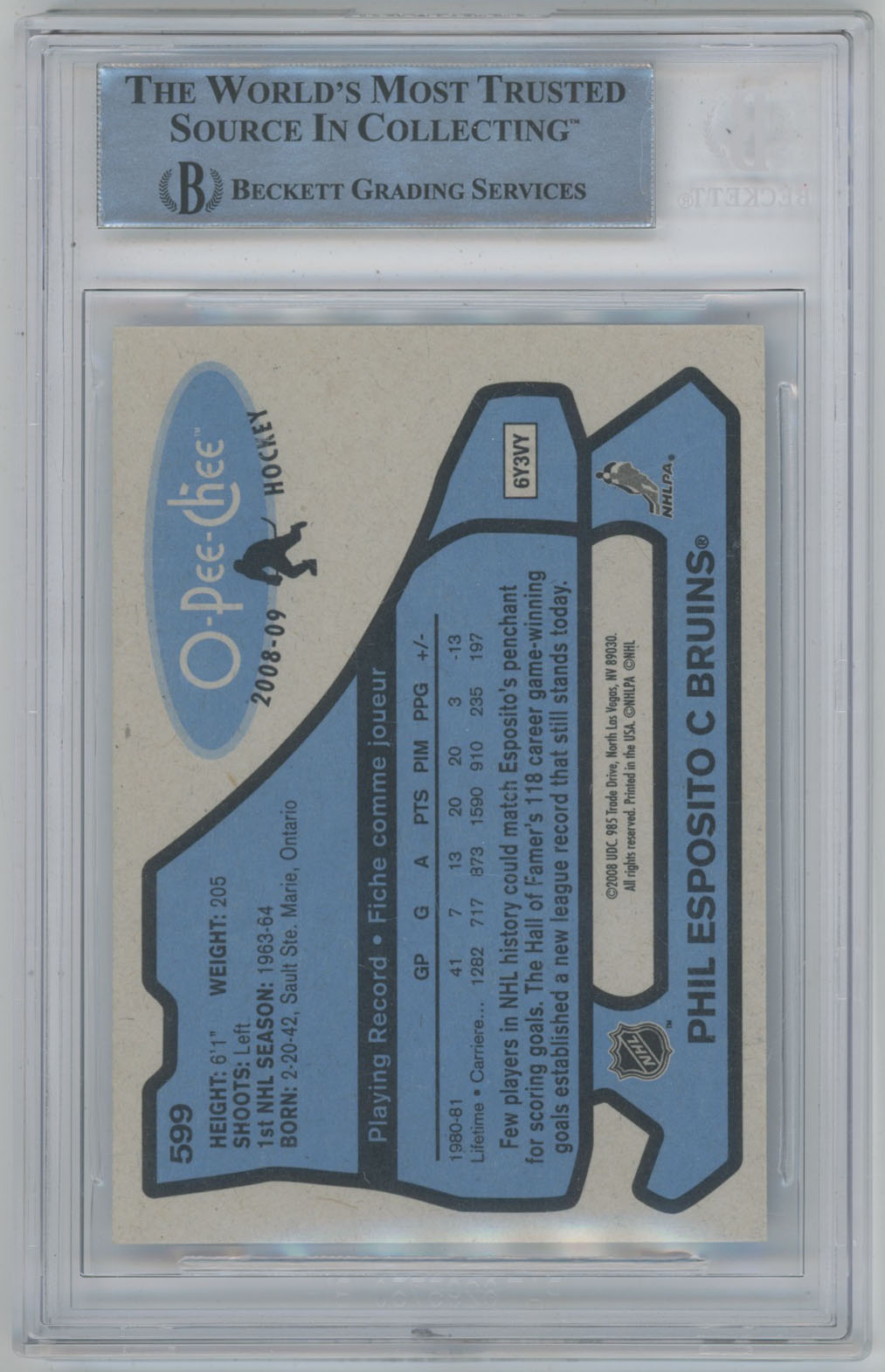 2008 O-Pee-Chee Retro 599 Phil Esposito Signed OPC Card Beckett Slabbed Beckett 10 (auto)