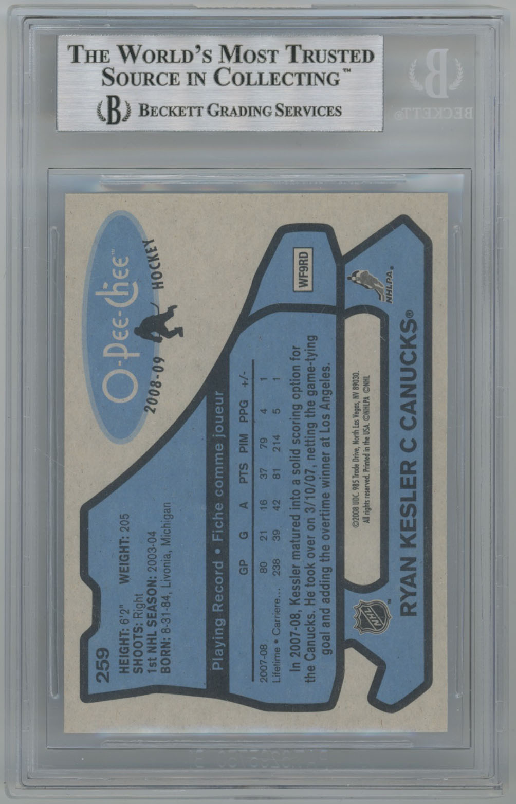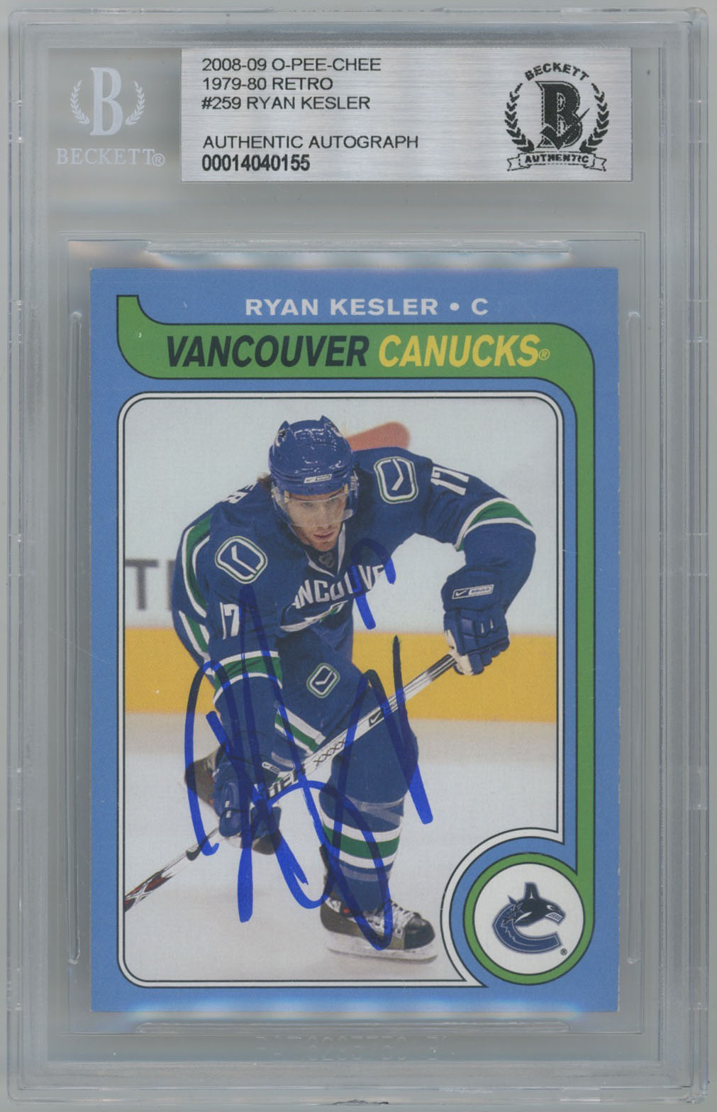 2008 O-Pee-Chee Retro 259 Ryan Kesler Signed Card Beckett Slabbed OPC