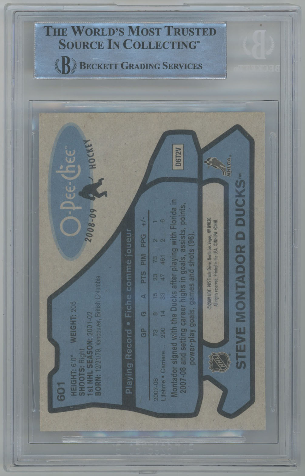 2008 O-Pee-Chee Retro 601 Steve Montador Signed Card Beckett Slabbed Ducks