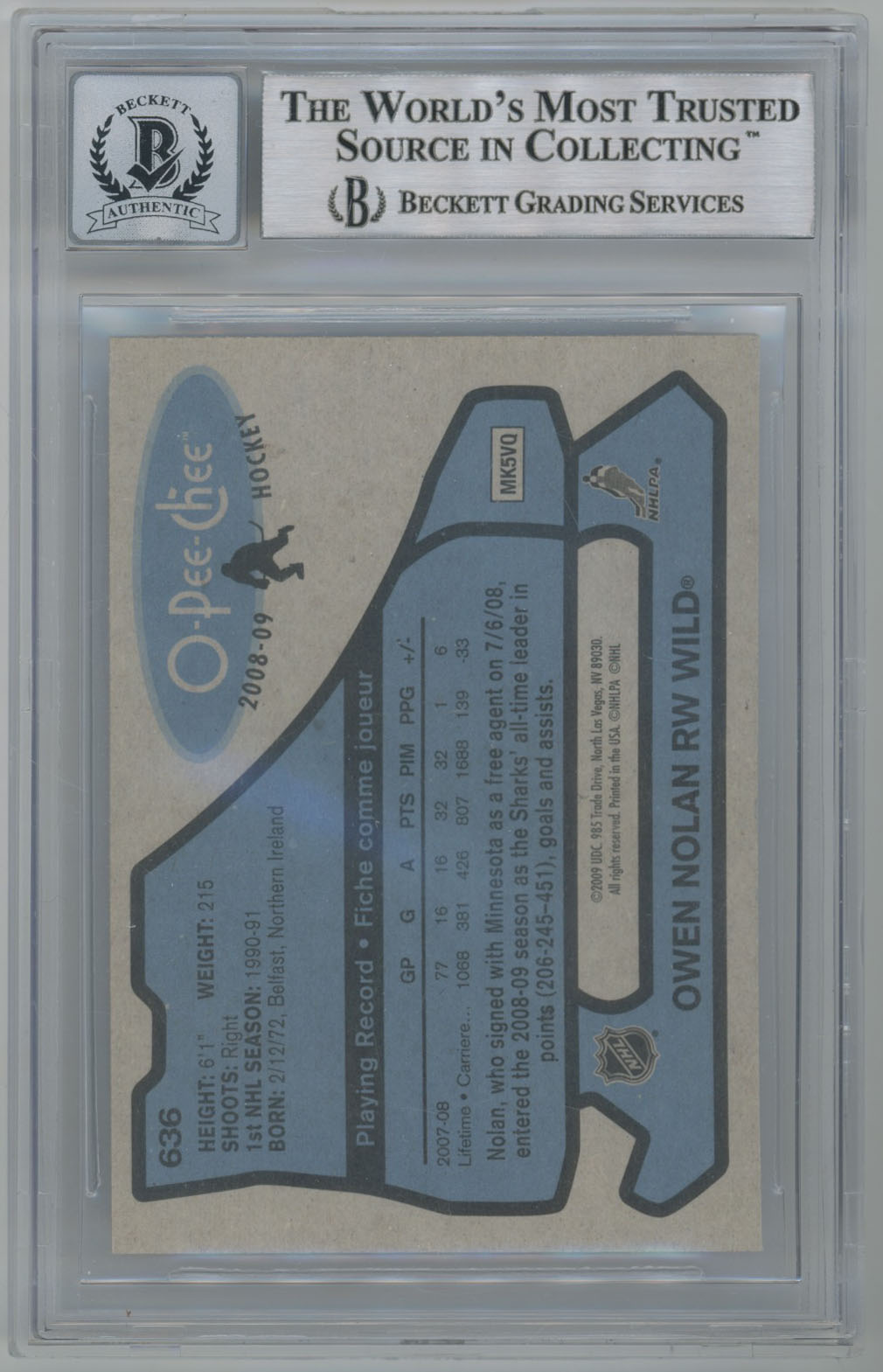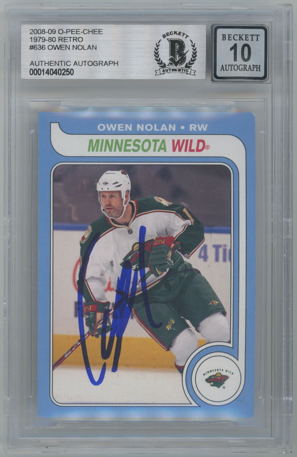 2008 O-Pee-Chee Retro 636 Owen Nolan Signed OPC Card Beckett Slabbed Beckett 10 (auto)