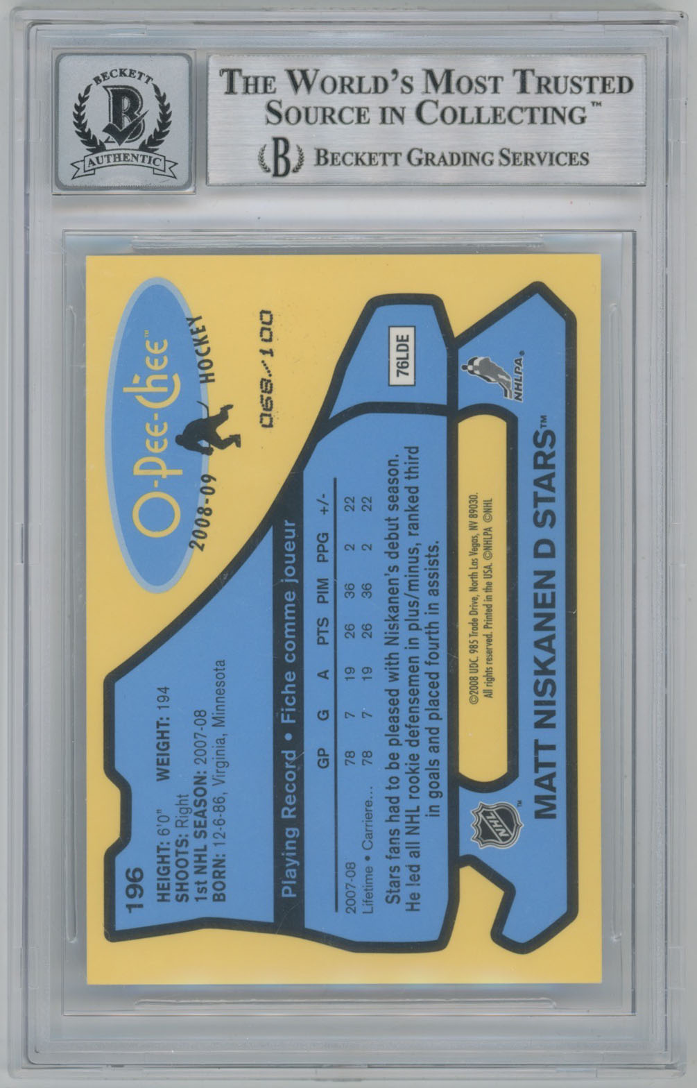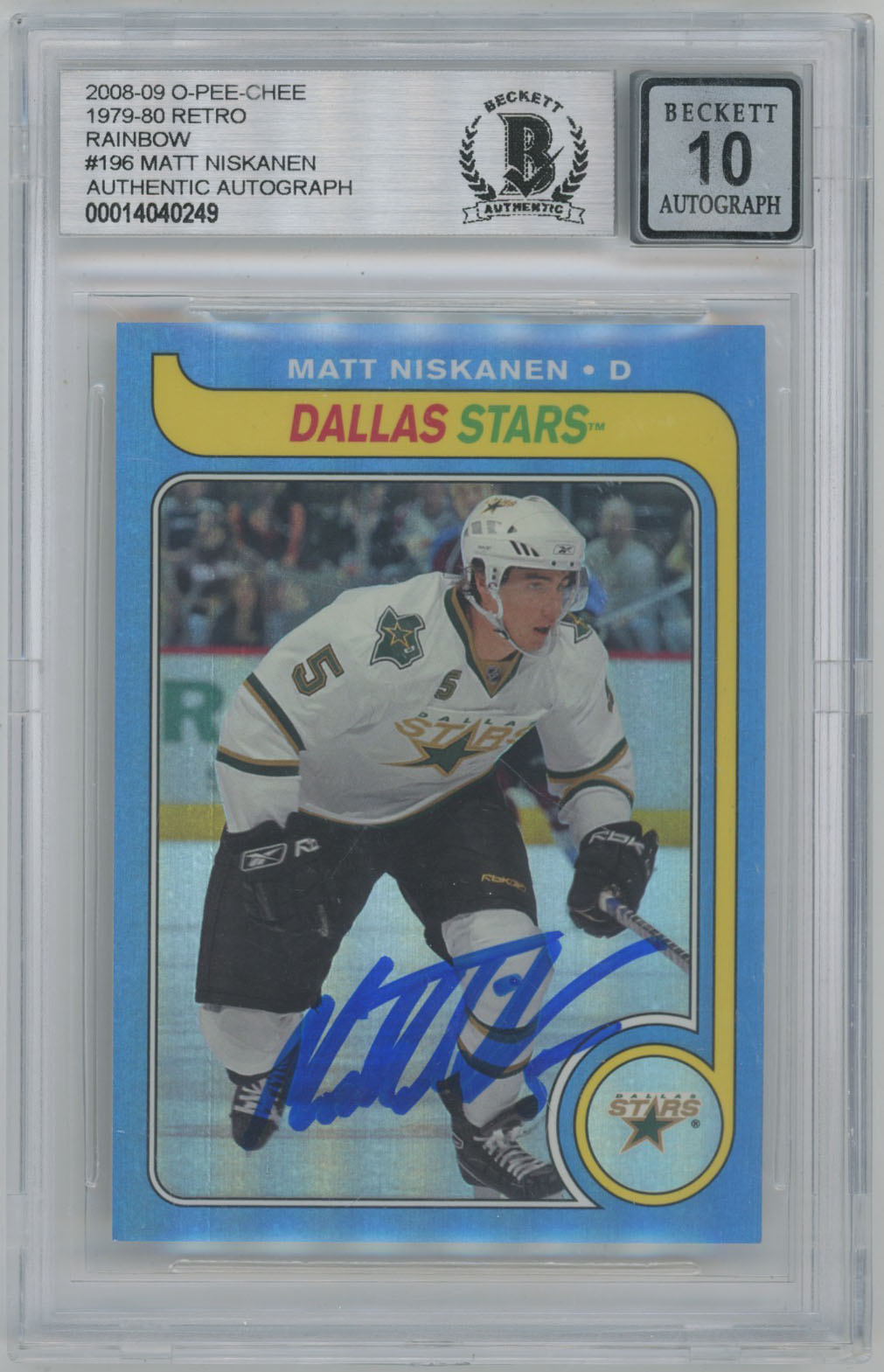 2008 O-Pee-Chee Retro 196 Rainbow 196 Matt Niskanen Signed Card Beckett Slabbed Beckett 10 (auto)