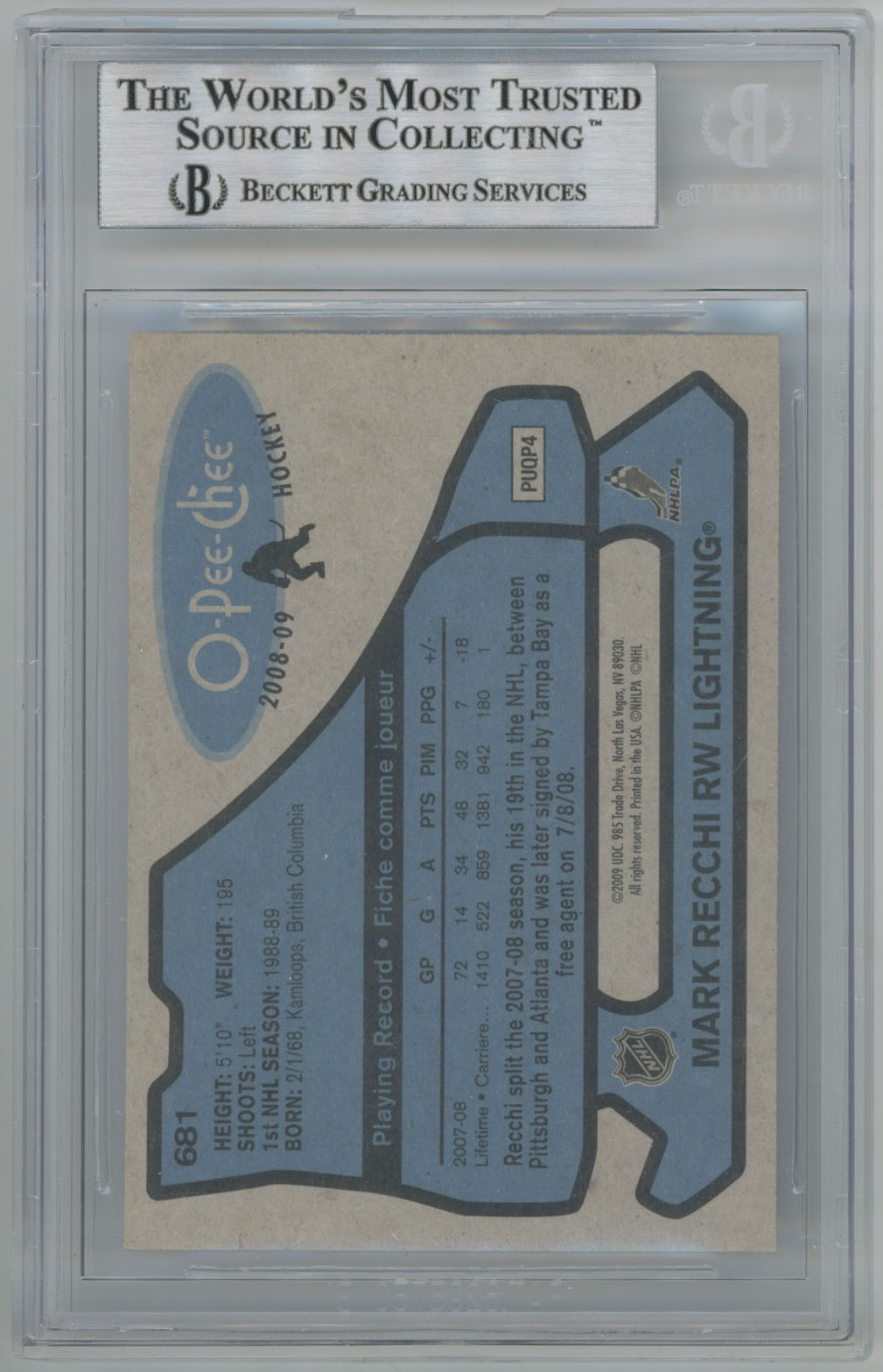 2008 O-Pee-Chee Retro 681 Mark Recchi Signed Card Beckett Slabbed Lightning