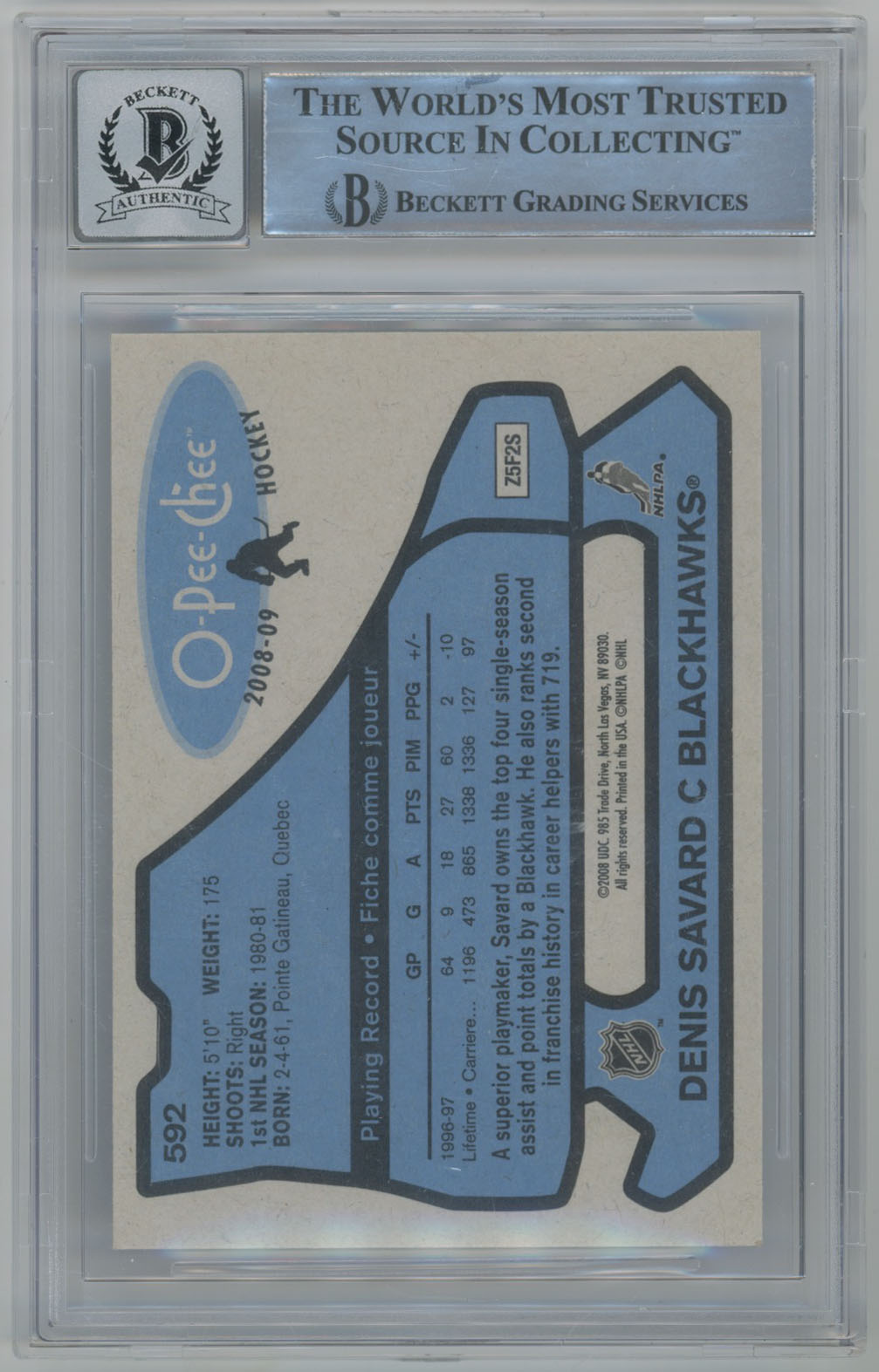 2008 O-Pee-Chee Retro 592 Denis Savard Signed OPC Card Beckett Slabbed Beckett 10 (auto)