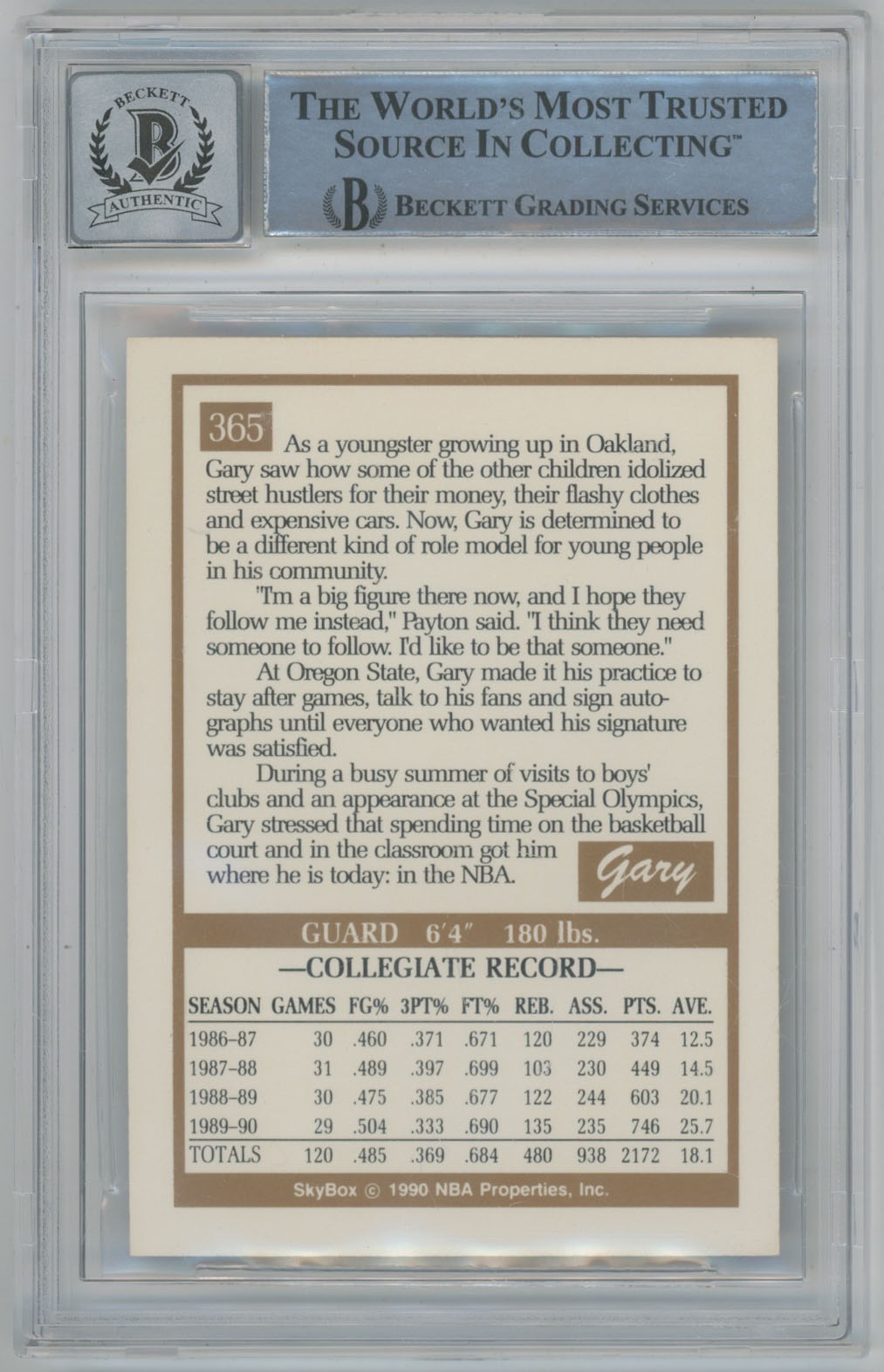 1990 Skybox 365 Gary Payton Signed Rookie Card - Beckett Slabbed w/inscription