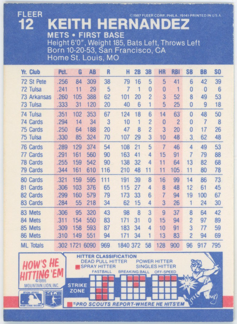 1987 Fleer 12 Keith Hernandez 9.5