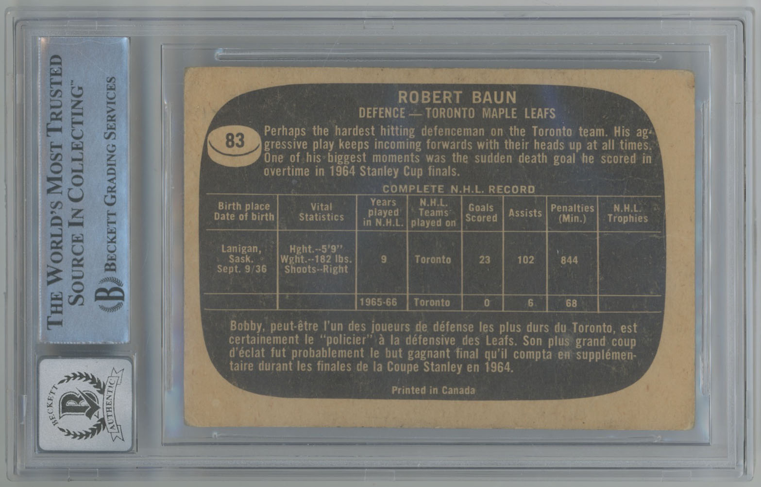 1966 Topps 83 Bobby Baun Signed Card Beckett Slabbed Slabbed