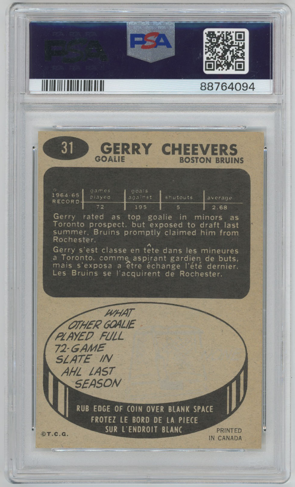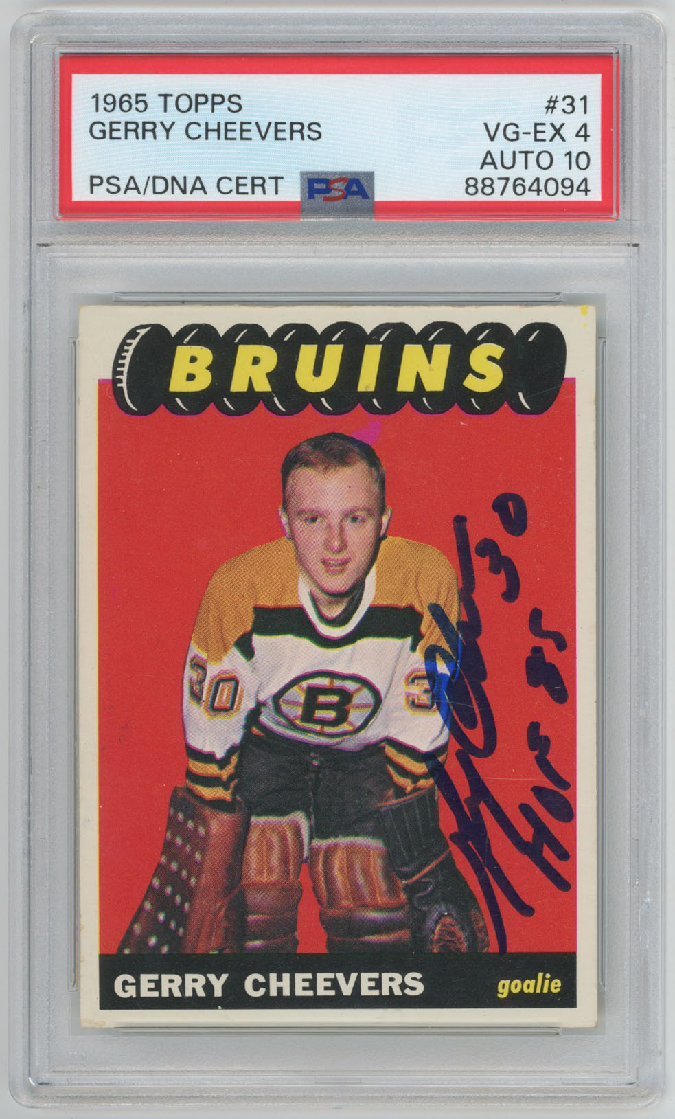 1965 Topps 31 Gerry Cheevers Signed Rookie RC HOF 85 PSA 4/10