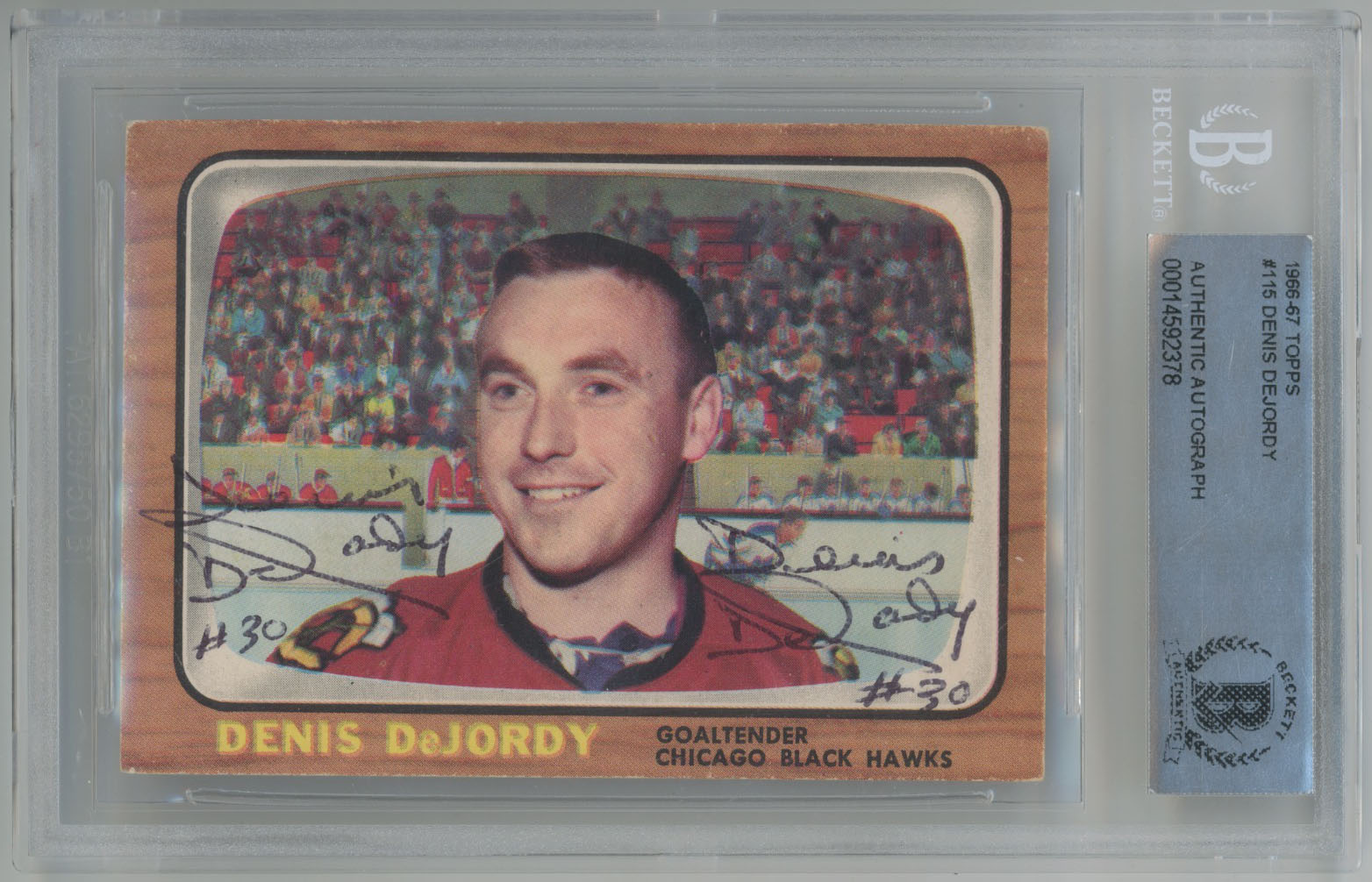 1966 Topps 115 Denis DeJordy Twice Signed Card Beckett Slabbed