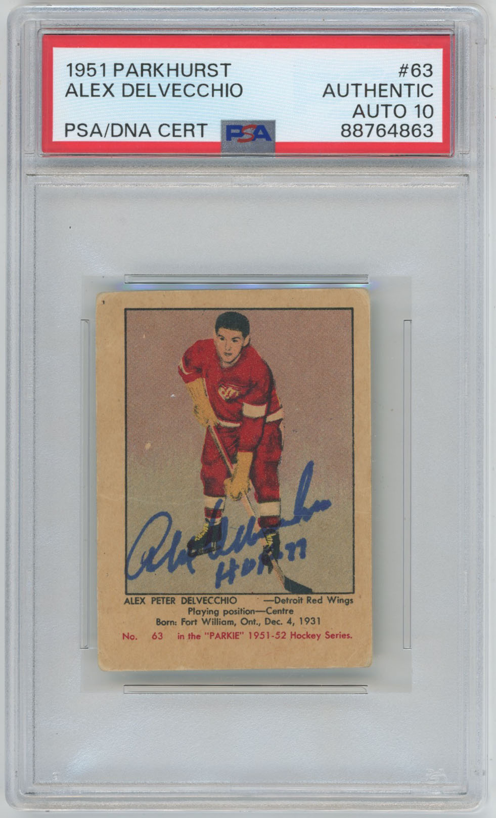 1951 Parkhurst 63 Alex Delvecchio Signed Rookie Card RC HOF PSA 10 (auto)