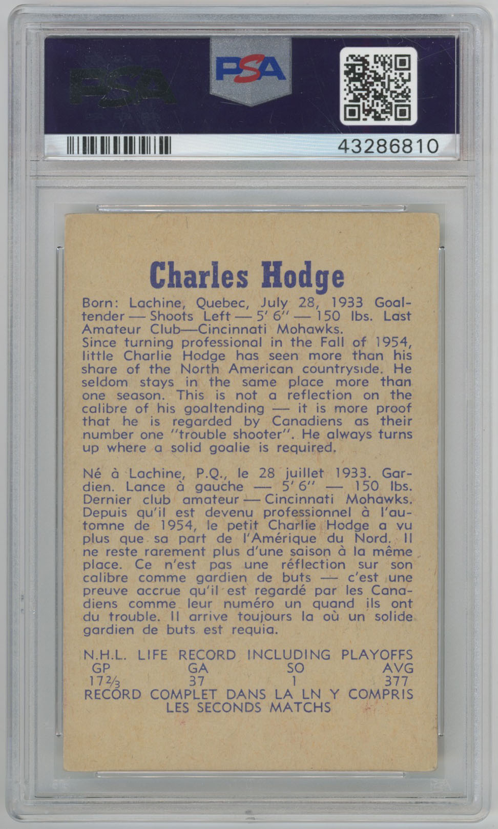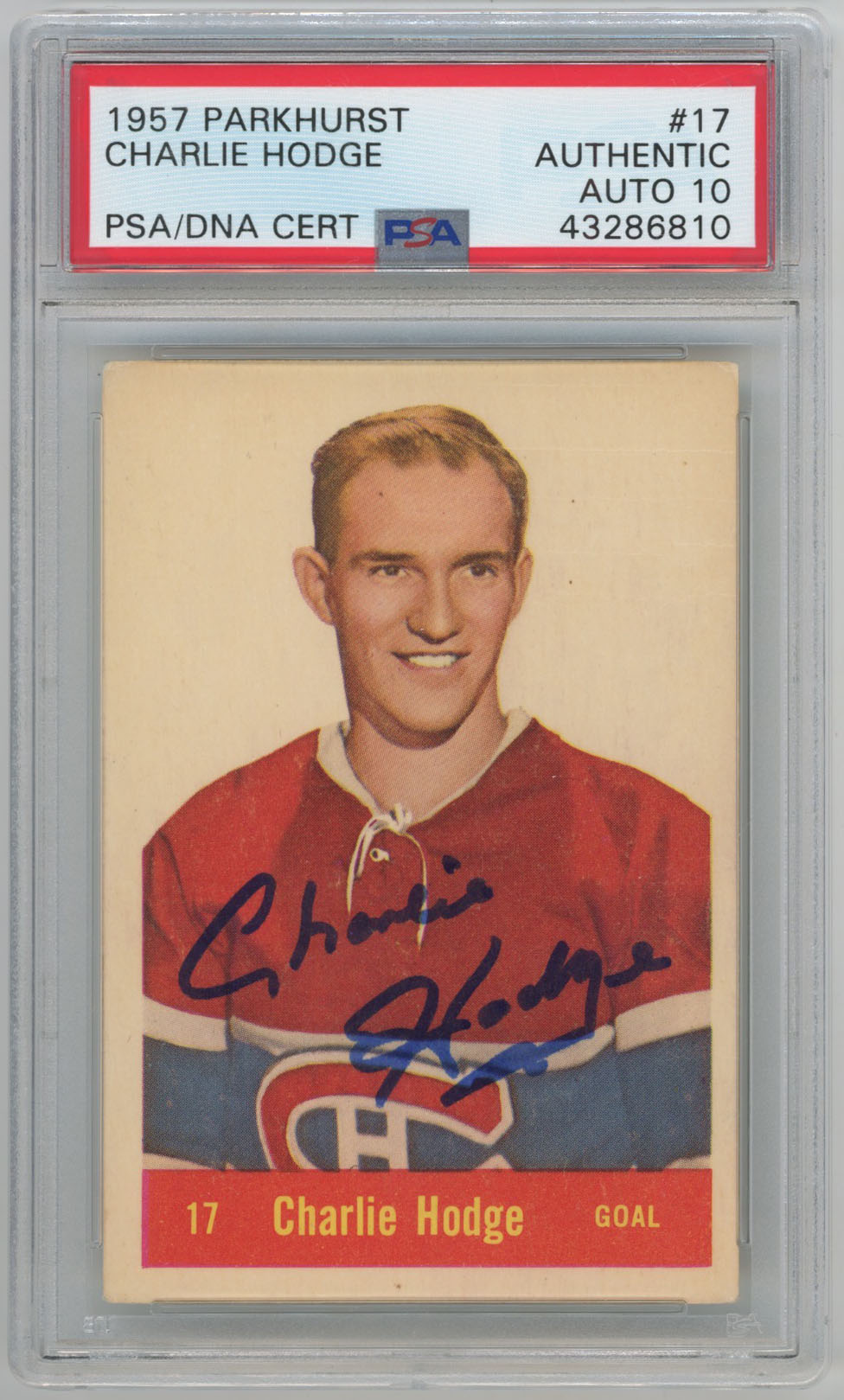1957 Parkhurst 17 Charlie Hodge Signed Rookie Card PSA 10 (auto)