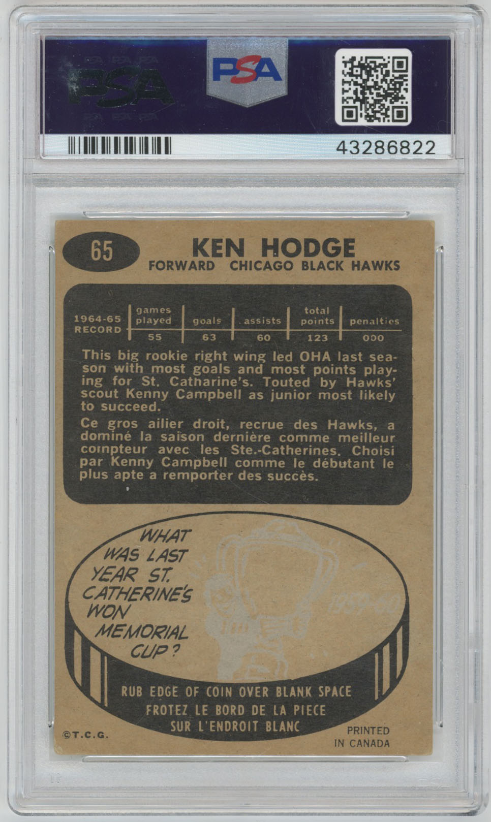 1965 Topps 65 Ken Hodge Signed Rookie Card PSA Slabbed