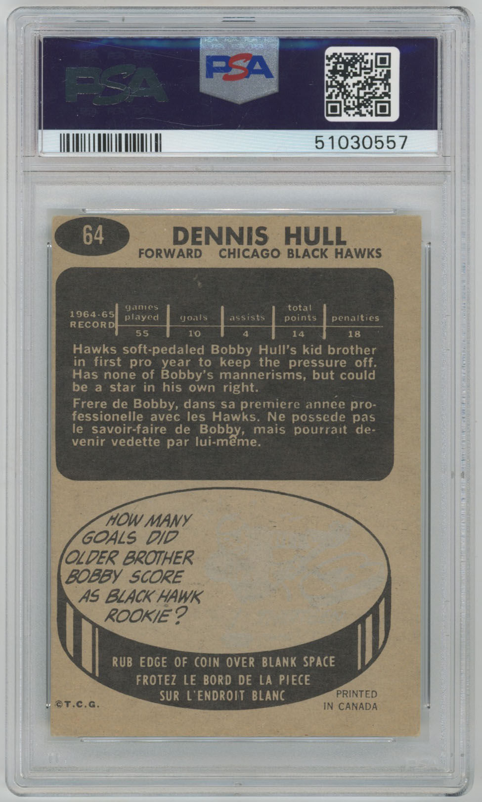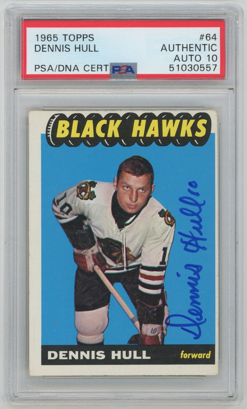 1965 Topps 64 Dennis Hull Signed Rookie Card PSA Slabbed