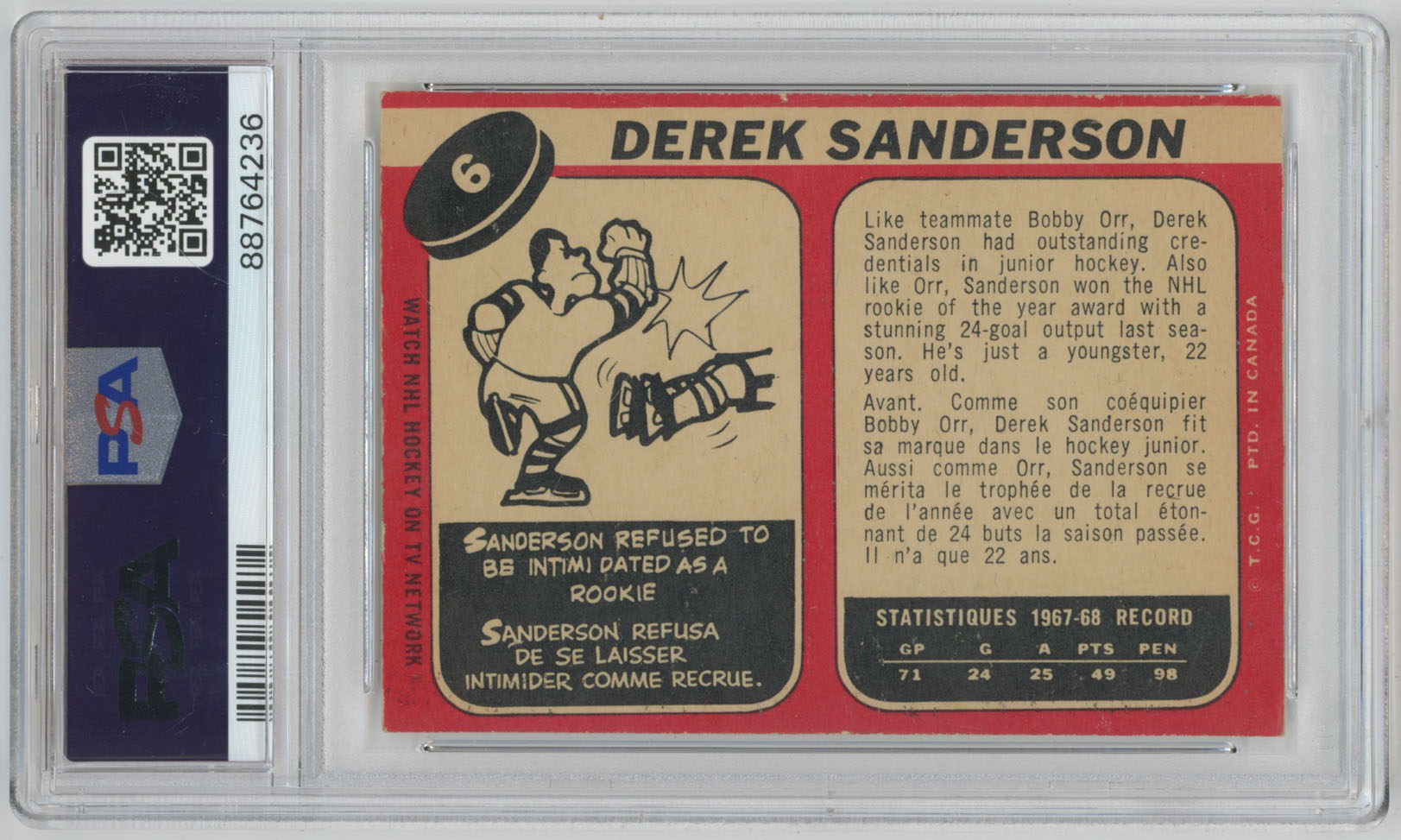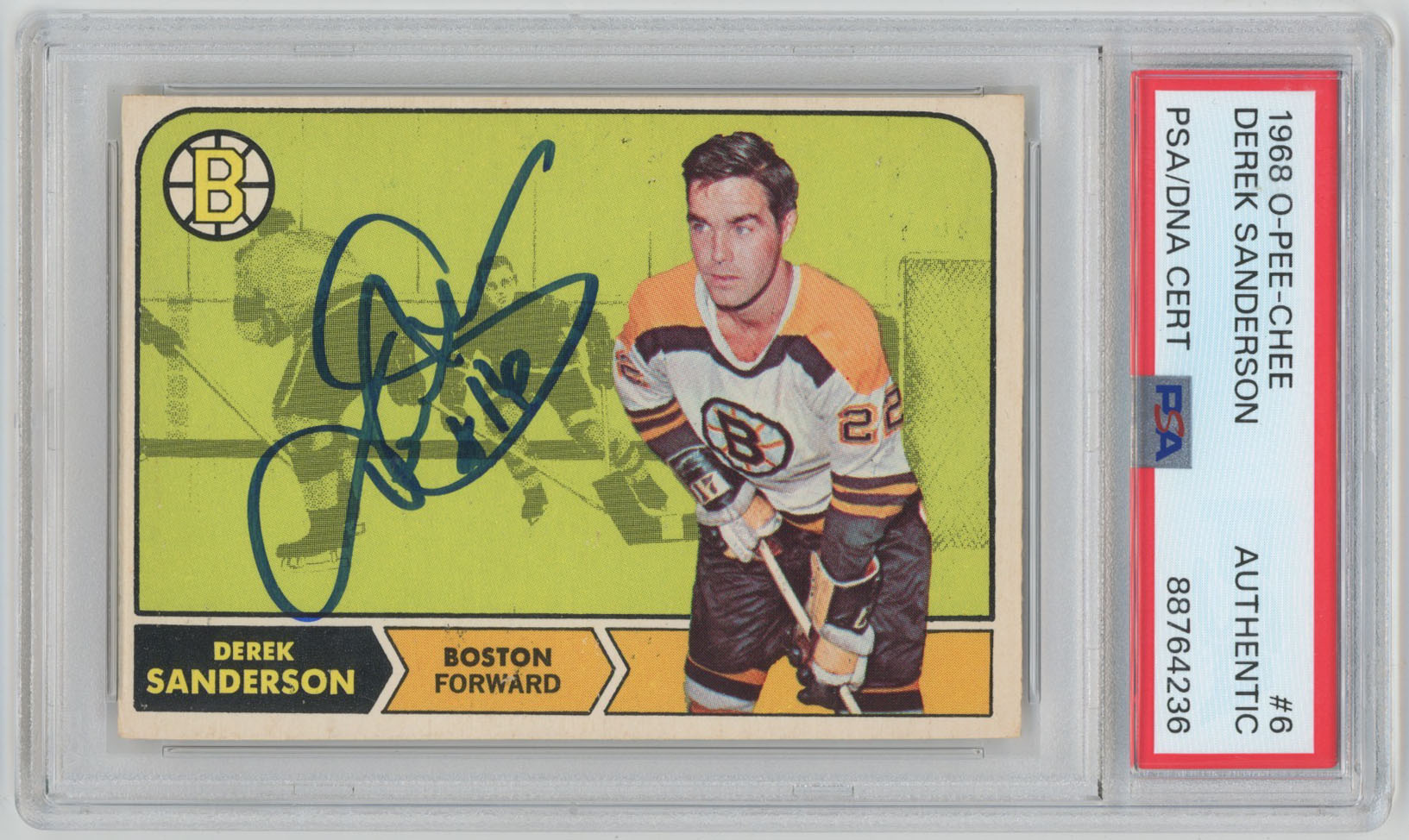 1968 O-Pee-Chee 6 Derek Sanderson Signed Card PSA Slabbed Boston