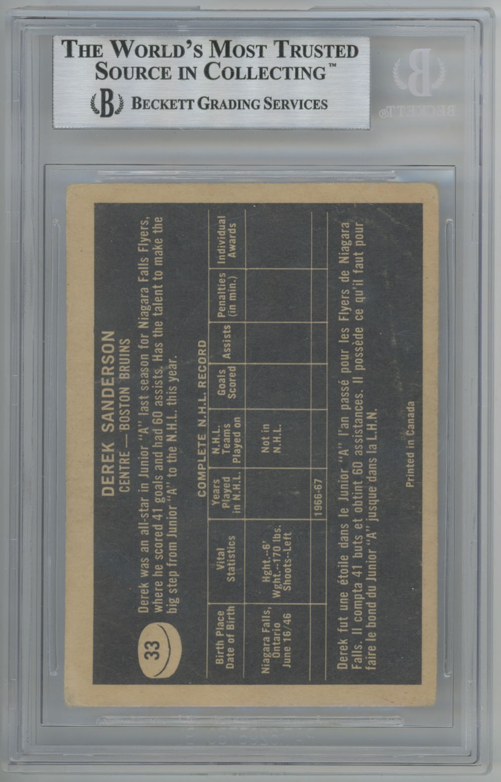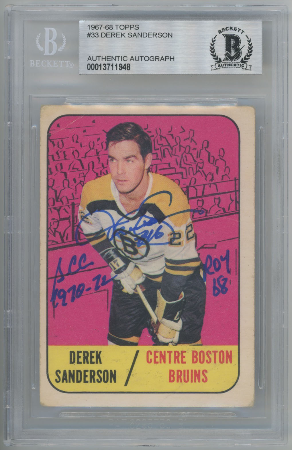 1967 Topps 33 Derek Sanderson Signed & Inscribed Rookie Card - Beckett Slabbed