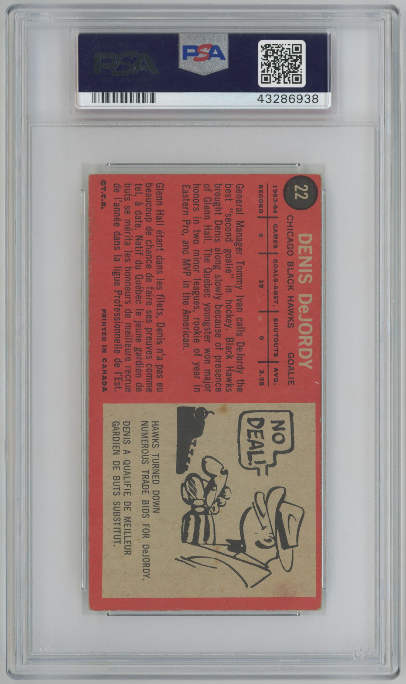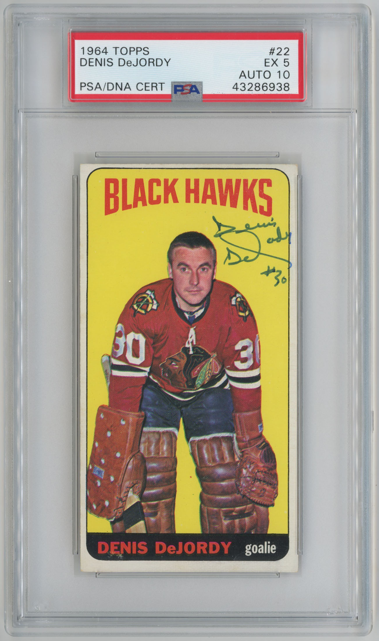 1964 Topps 22 Denis DeJordy Signed Card 5 PSA Slabbed