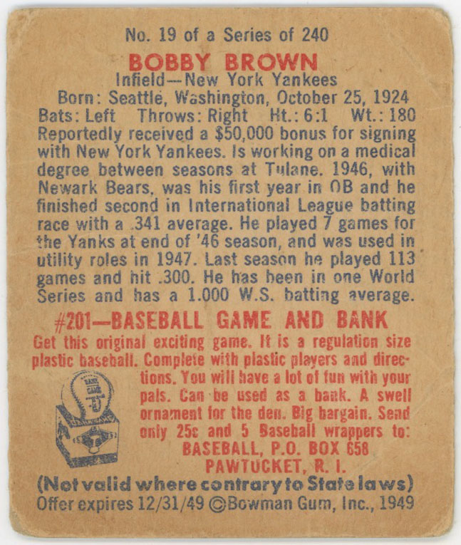 1949 Bowman 19 Bobby Brown Signed Rookie Card 9.5