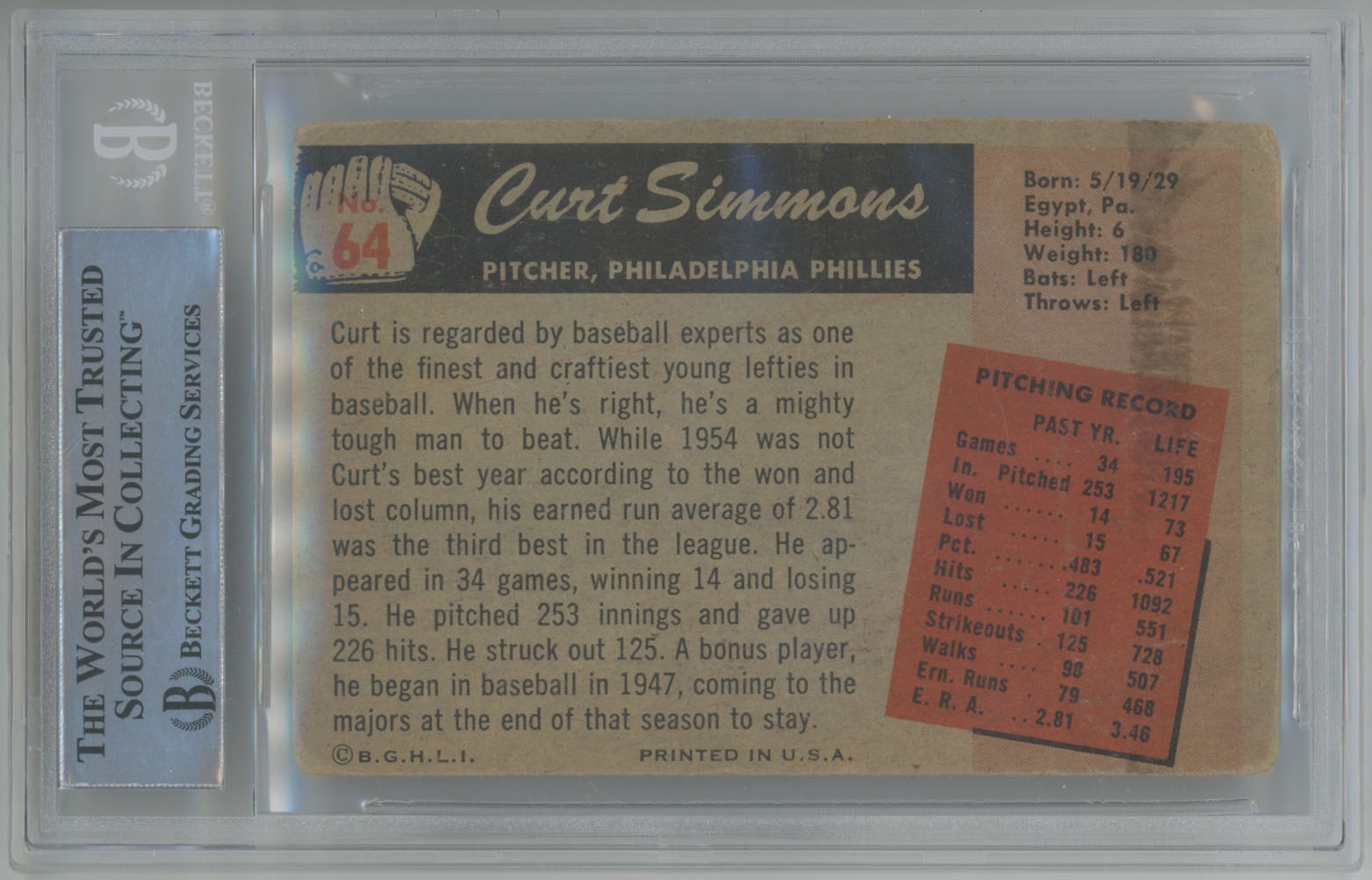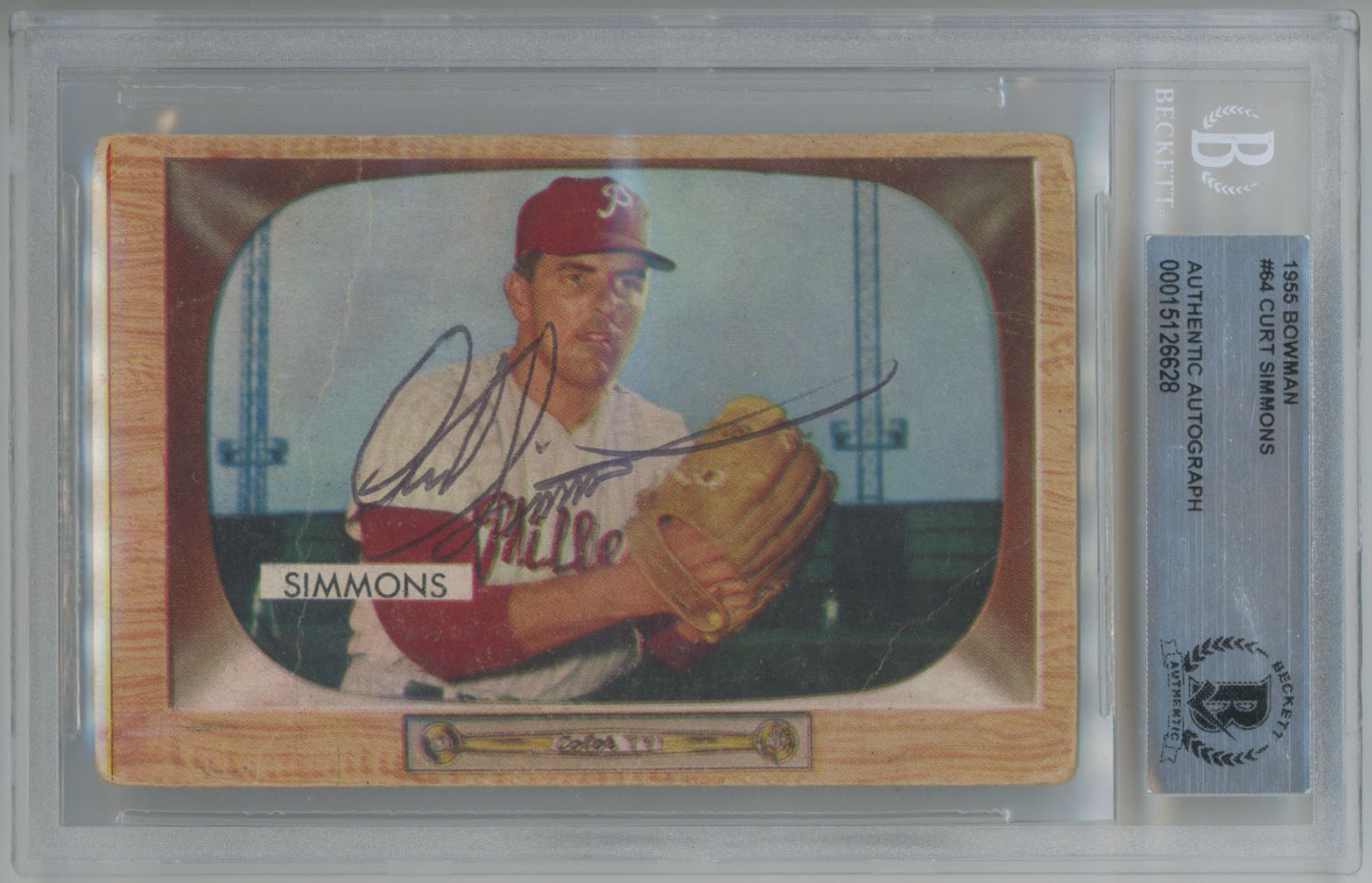 1955 Bowman 64 Curt Simmons Signed Card - Beckett Slabbed