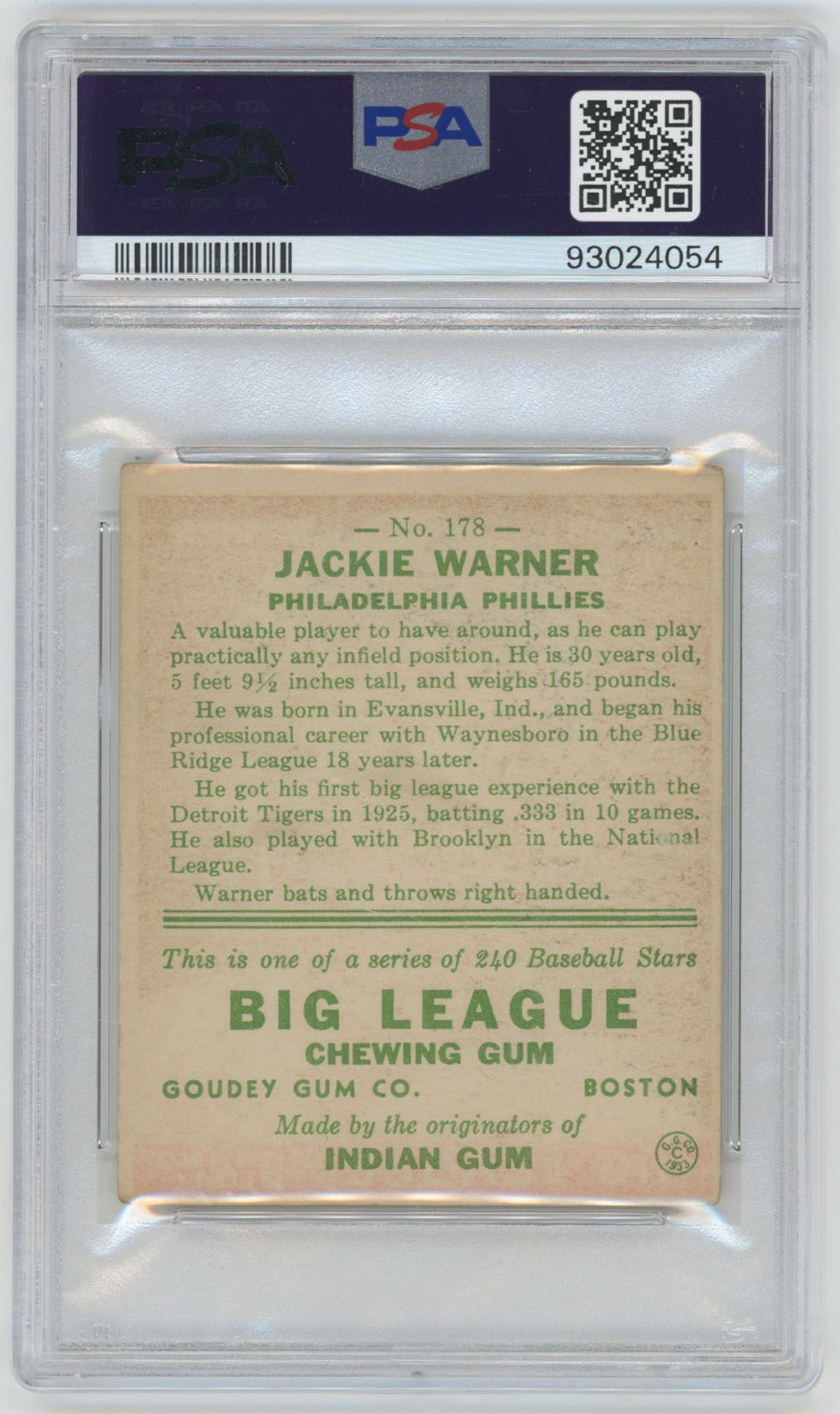 1933 Goudey 178 Warner PSA 4