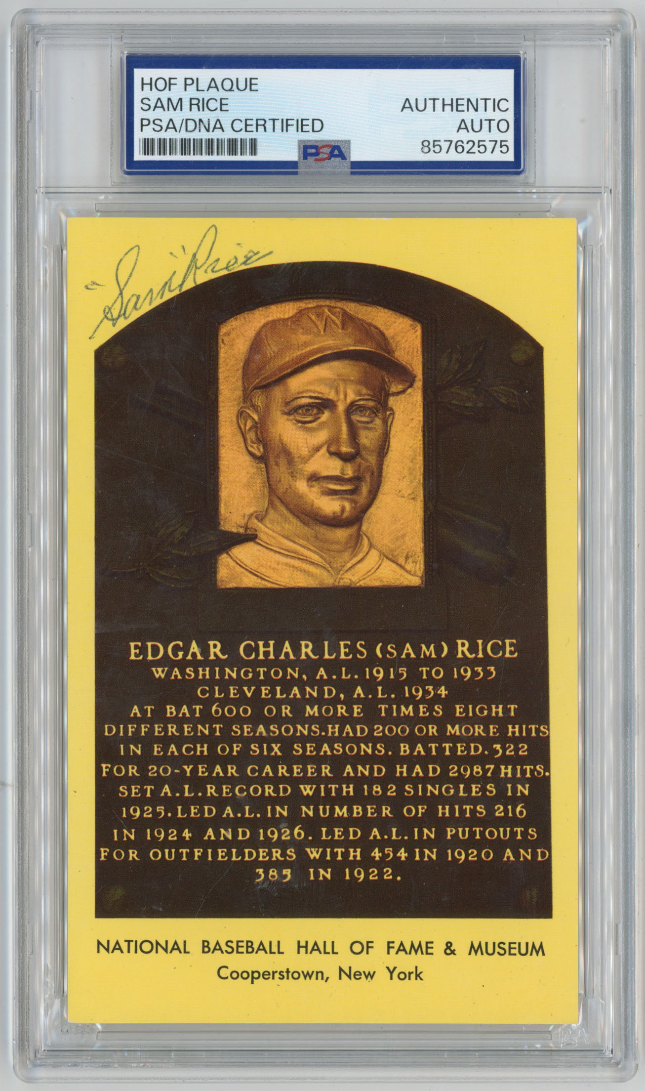 Yellow HOF Plaque 134 Sam Rice 8 (PSA Slabbed A)