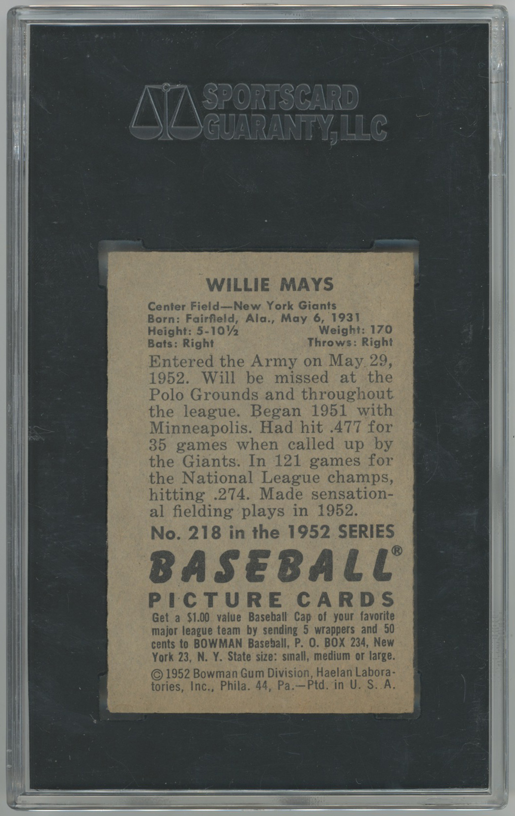 1952 Bowman 218 Willie Mays SGC 4