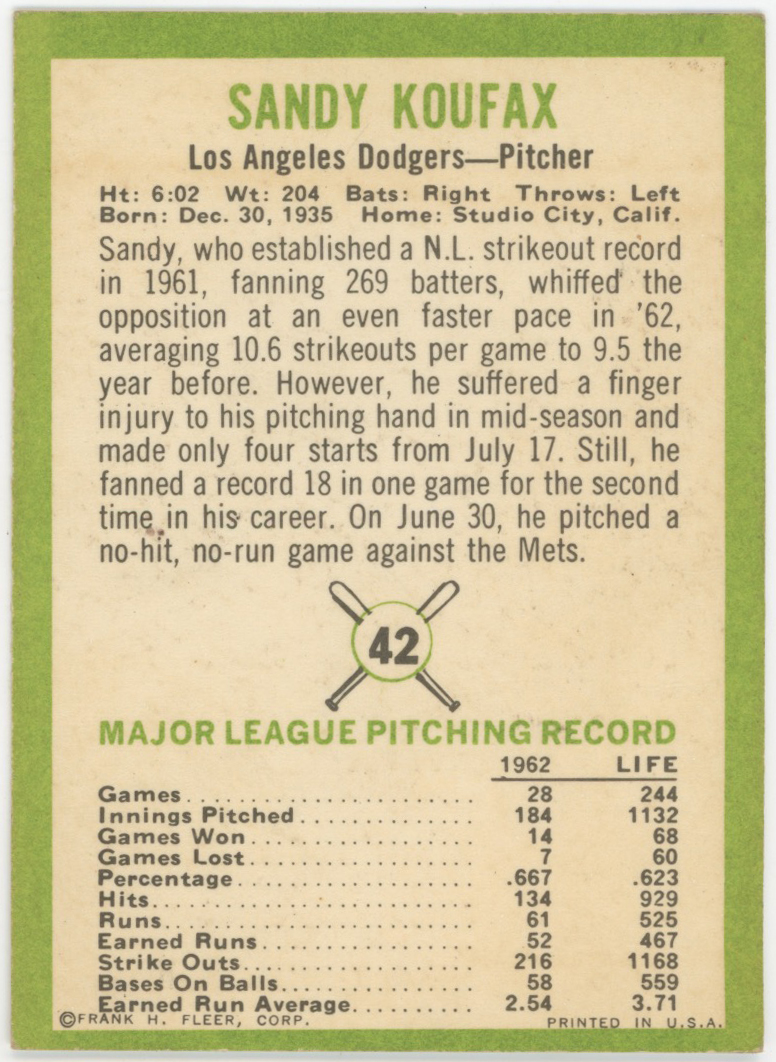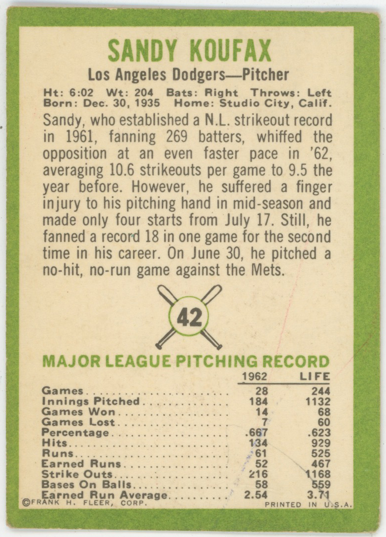 1963 Fleer 42 Koufax VG-Ex/Ex