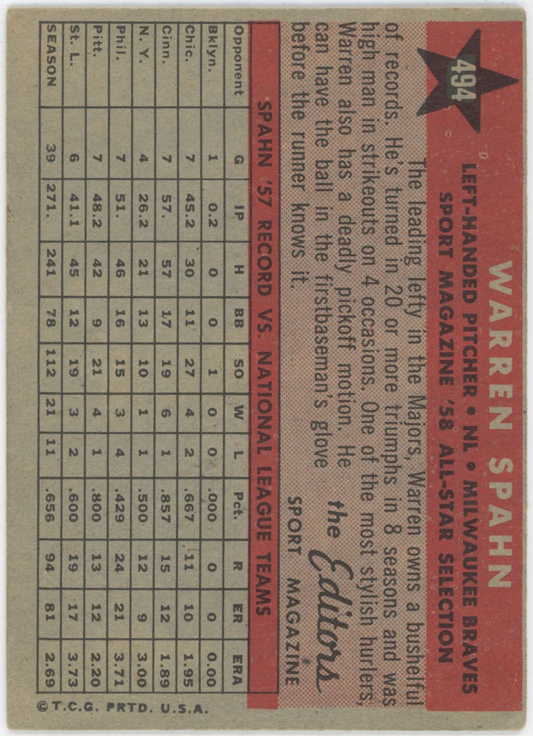 1958 Topps 494 Spahn AS VG+