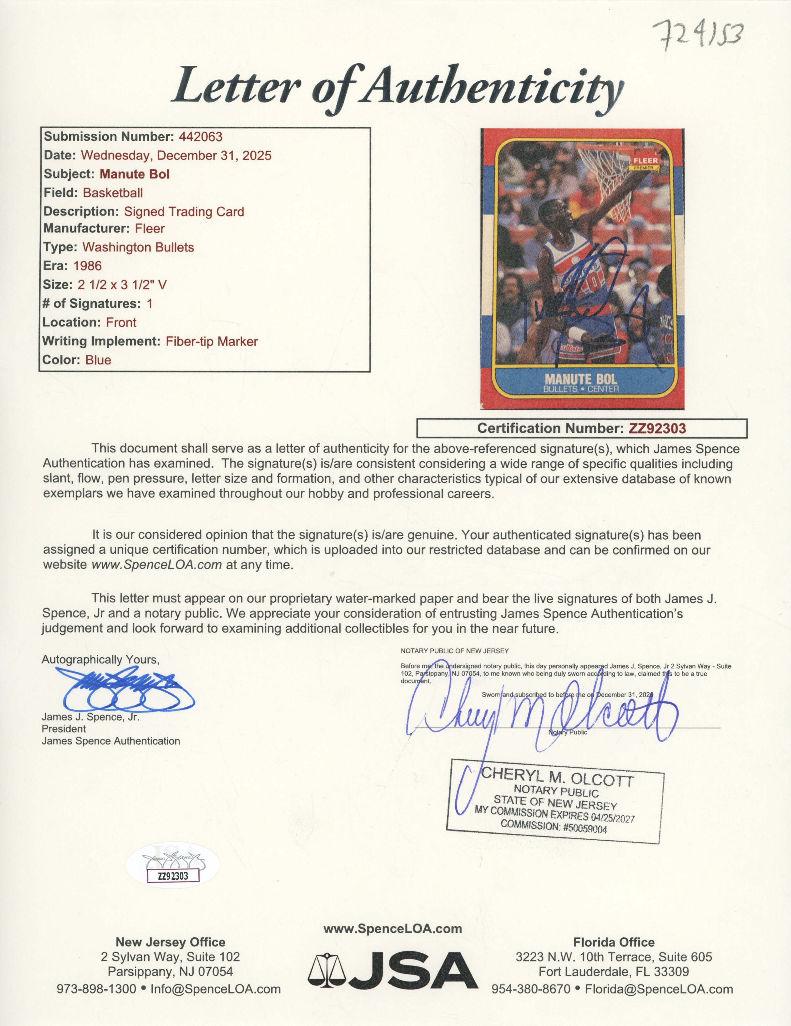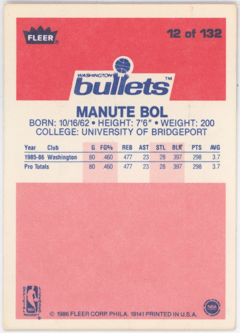 1986 Fleer 12 Manute Bol Auto Card 9 JSA LOA (FULL)