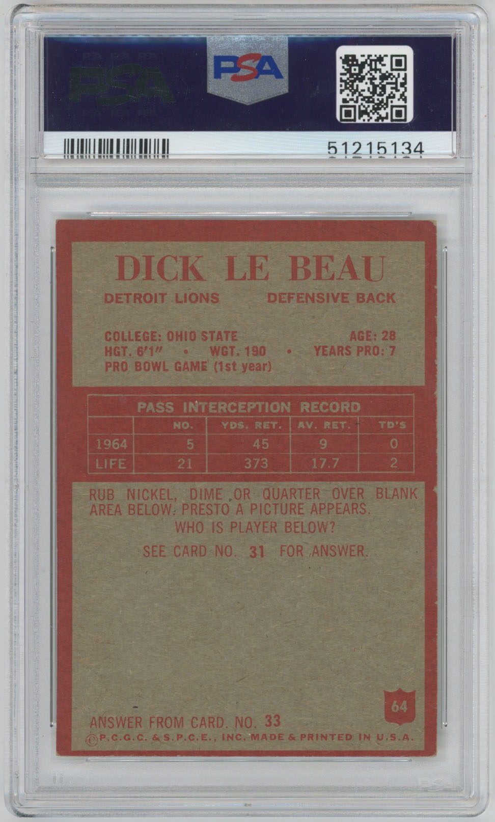 1965 Philadelphia 64 Dick LeBeau Signed Rookie Card PSA RC