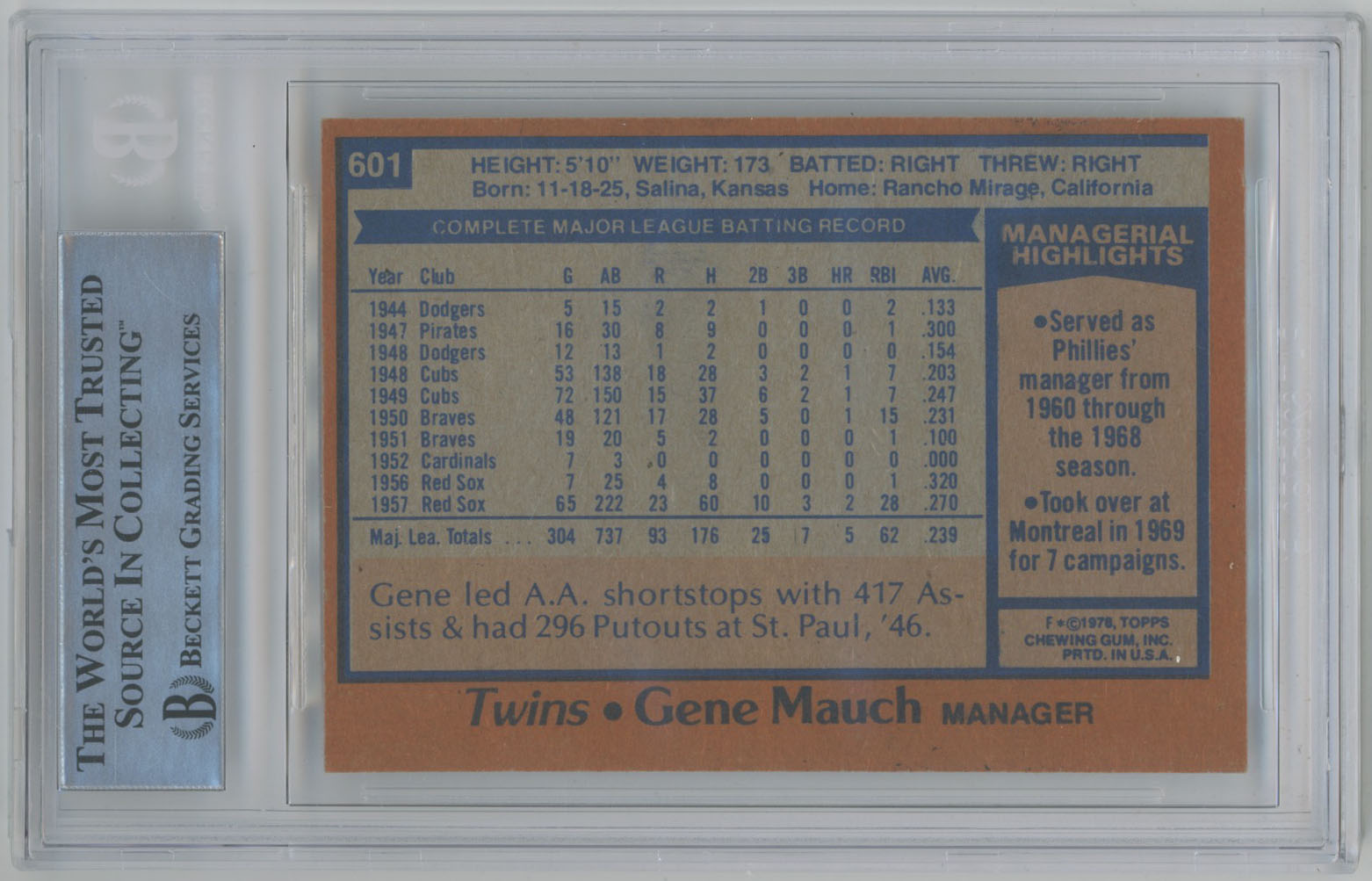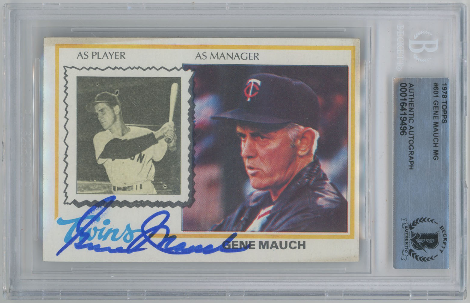 1978 Topps 601 Gene Mauch Signed Card - Beckett Slabbed