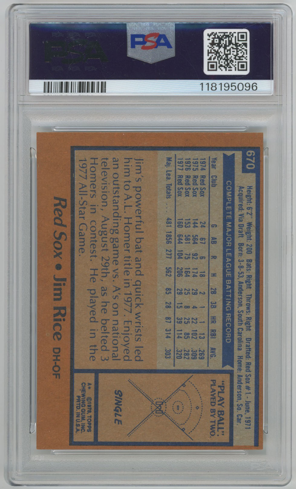 1978 Topps 670 Jim Rice Signed Card PSA 7/10