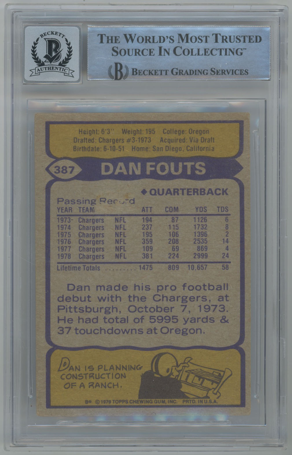 1979 Topps 387 Dan Fouts Signed Card Beckett 10 (auto)