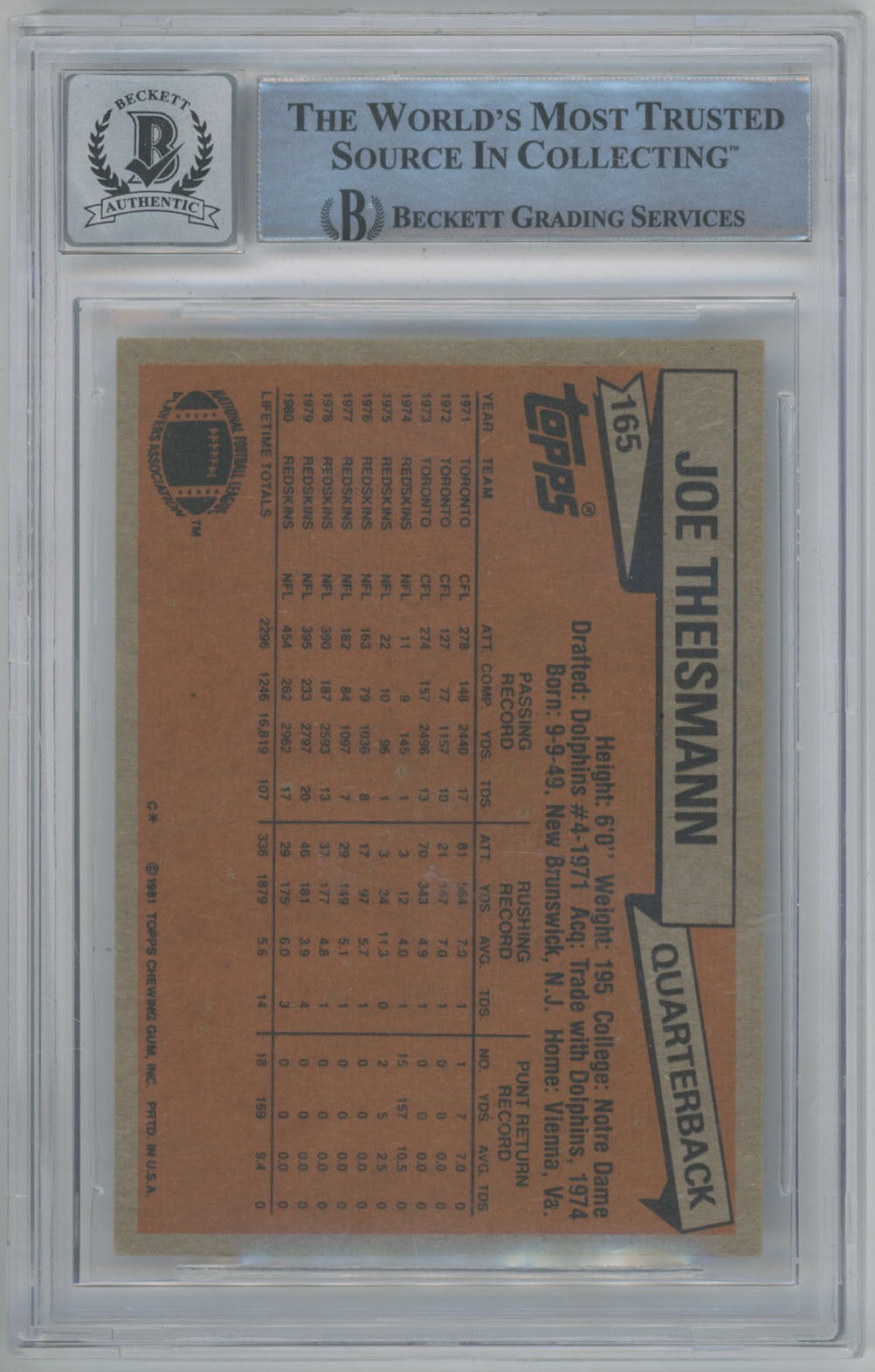 1981 Topps 165 Joe Thiesmann Signed Card Beckett 10 (auto)