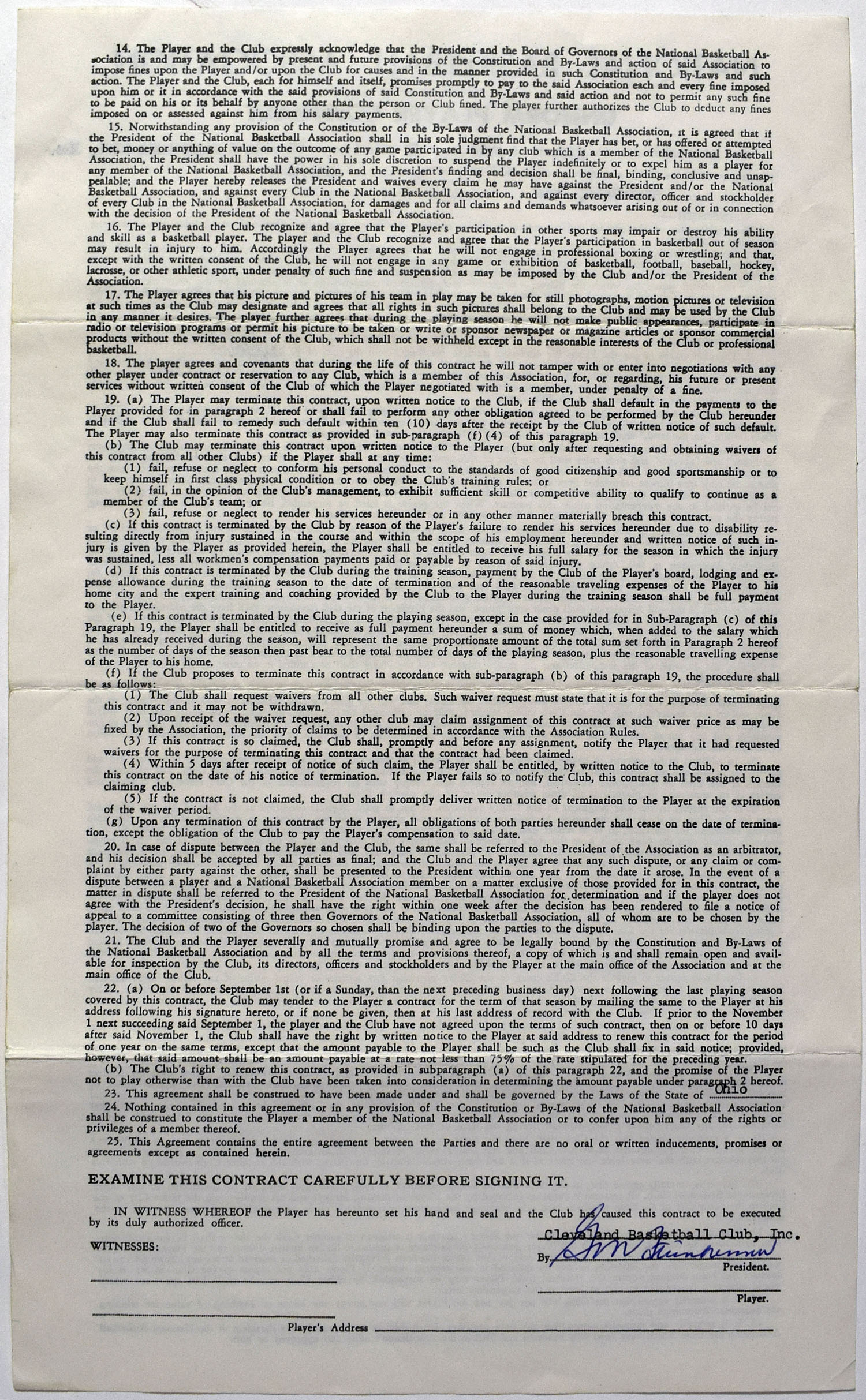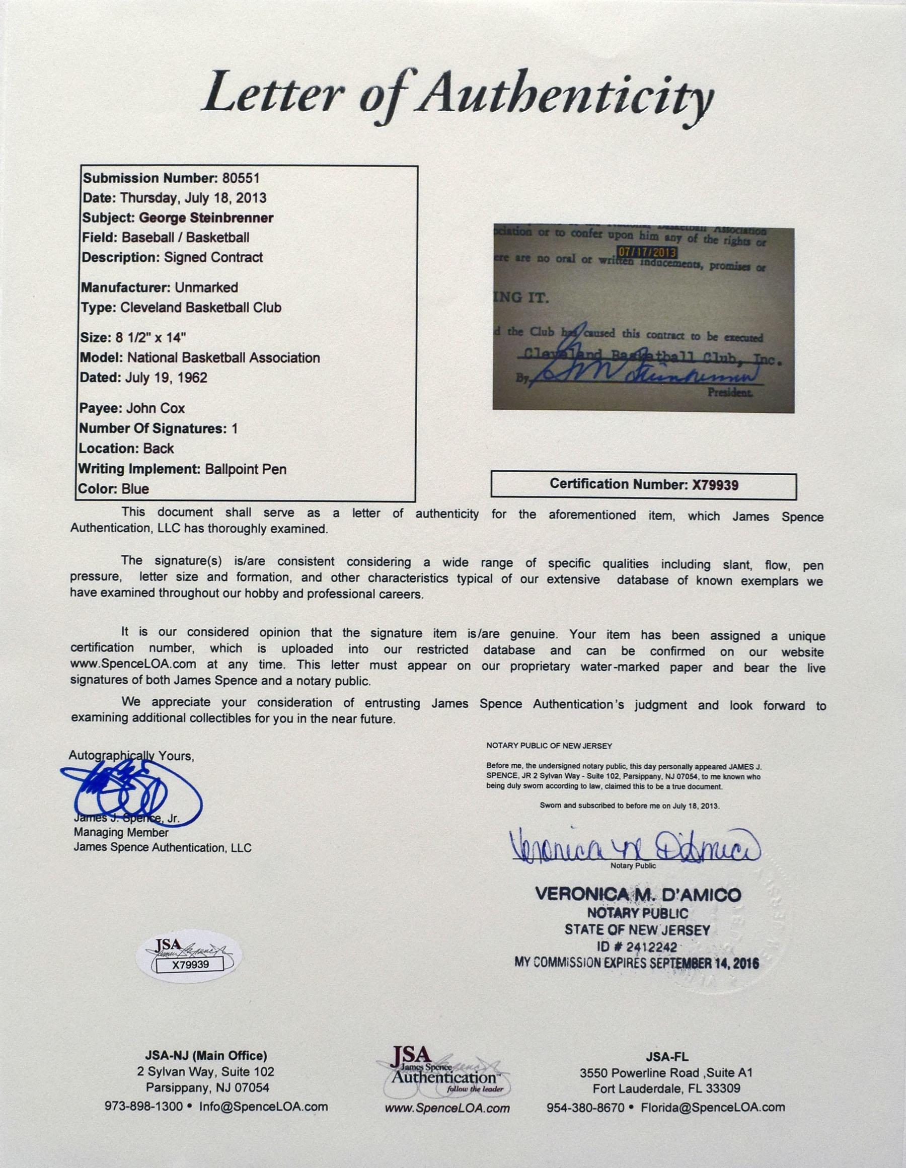 Contract Steinbrenner, George Signed 1962 Cleveland Pipers Contract 9.5 JSA LOA (FULL)