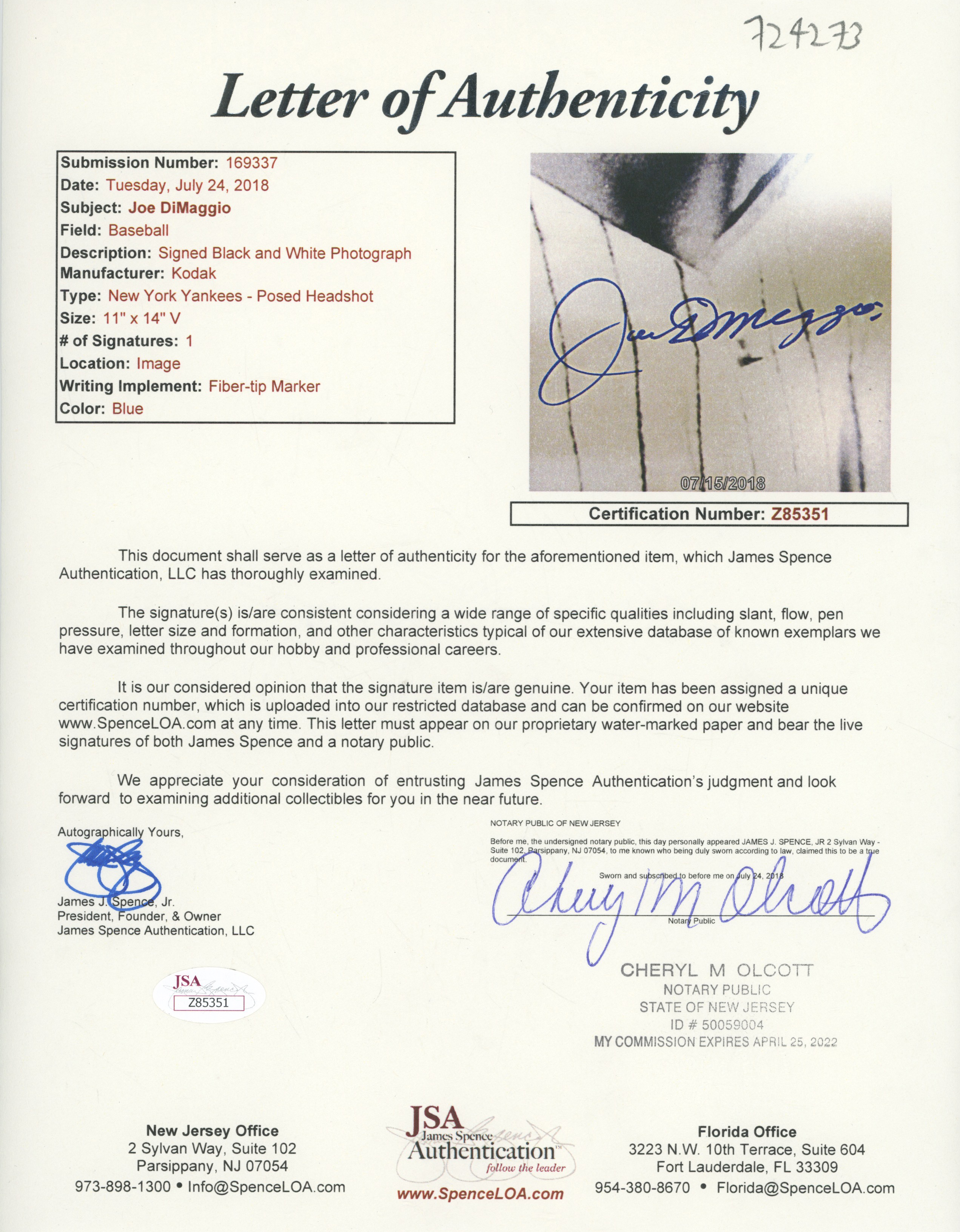 Large Print DiMaggio Signed/Framed 9.5 JSA LOA (FULL)