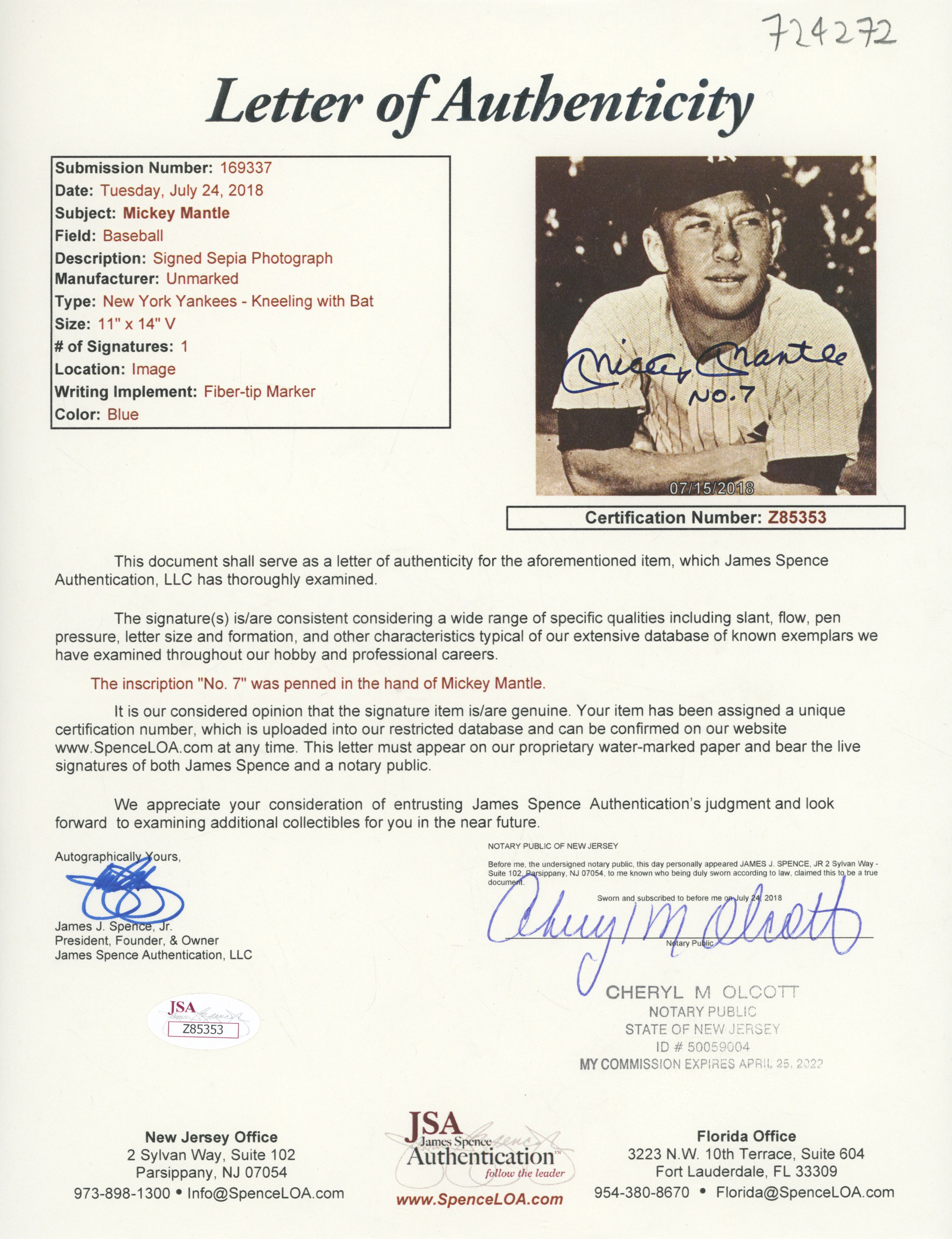 Large Print Mantle, Mickey (Amore) 9.5 JSA LOA (FULL)