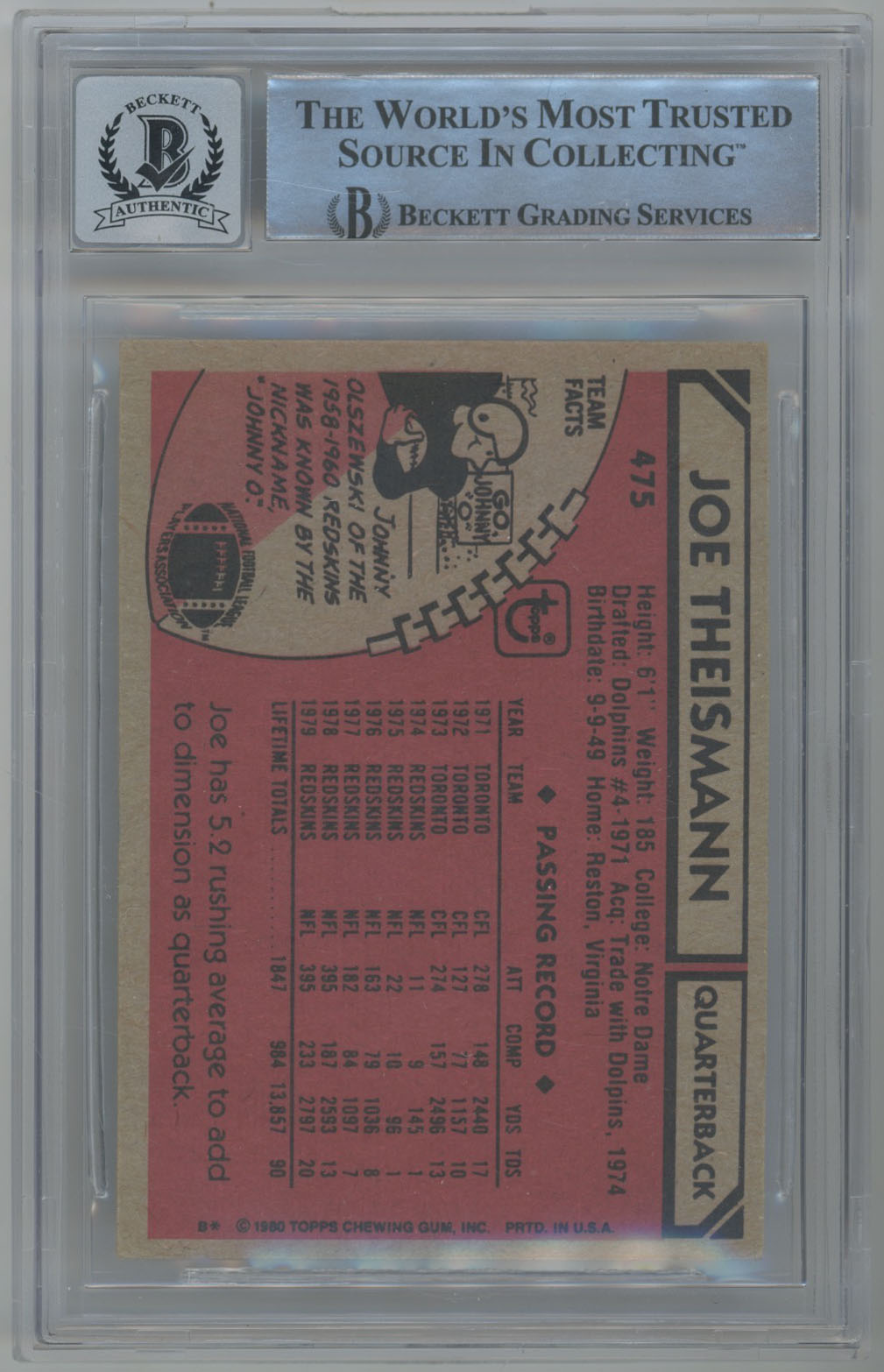 1980 Topps 475 Joe Thiesmann Signed Card Beckett 10 (auto)
