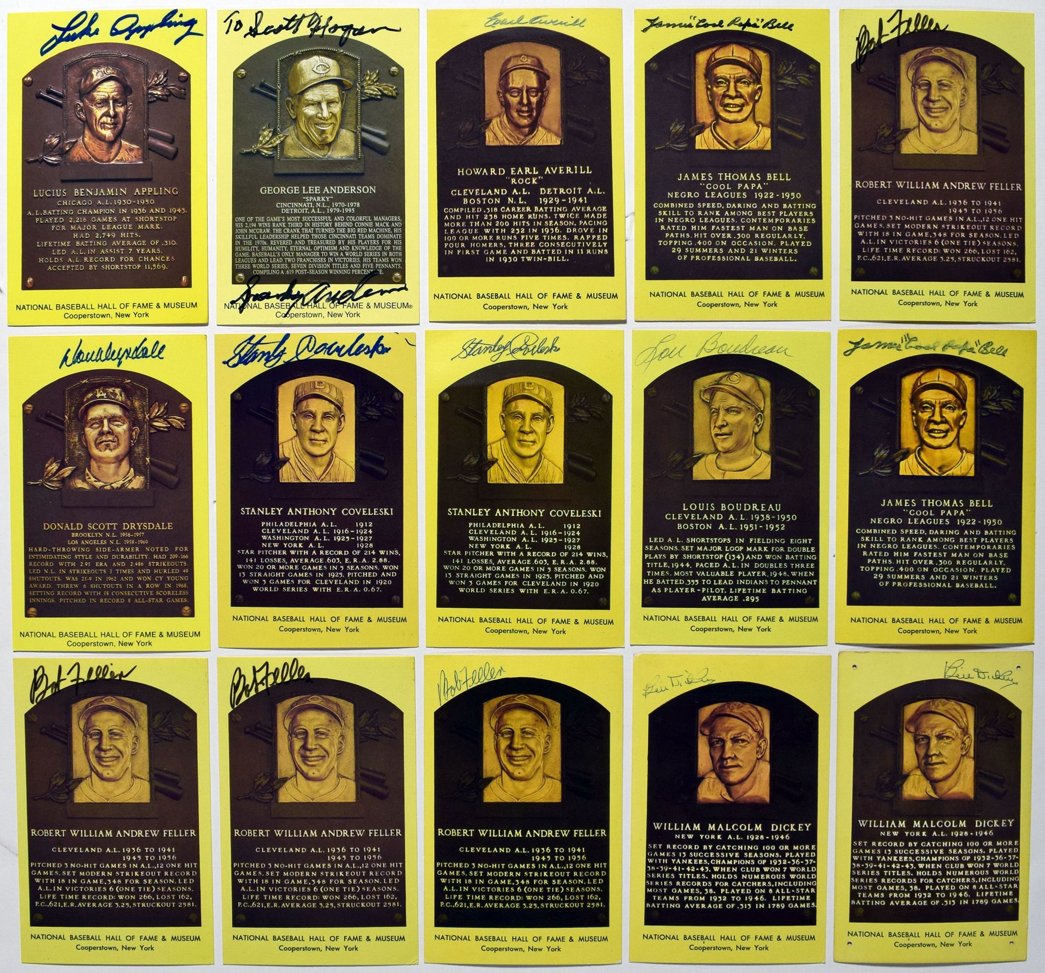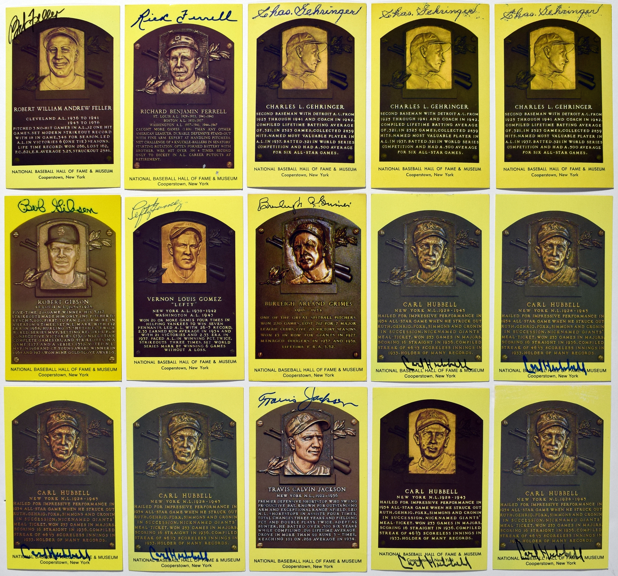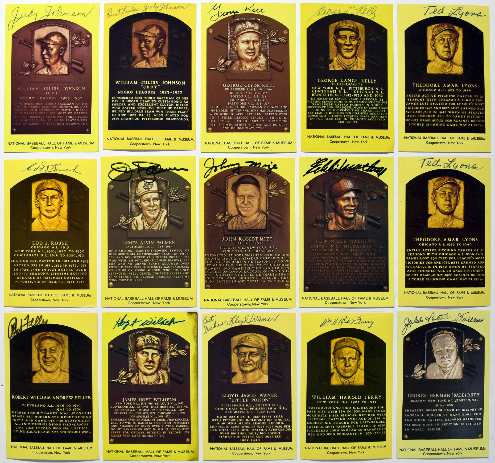 Yellow HOF Plaque Lot of 45 signed plaques w/Dickey, Gomez, Mathews, Roush 8.5